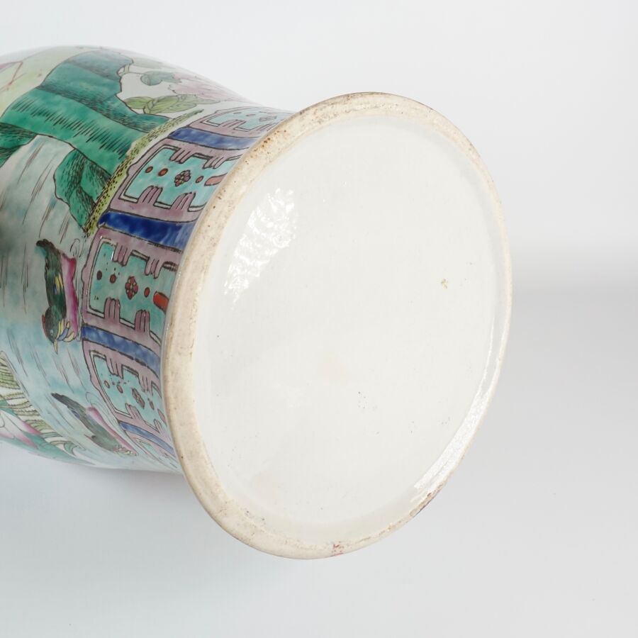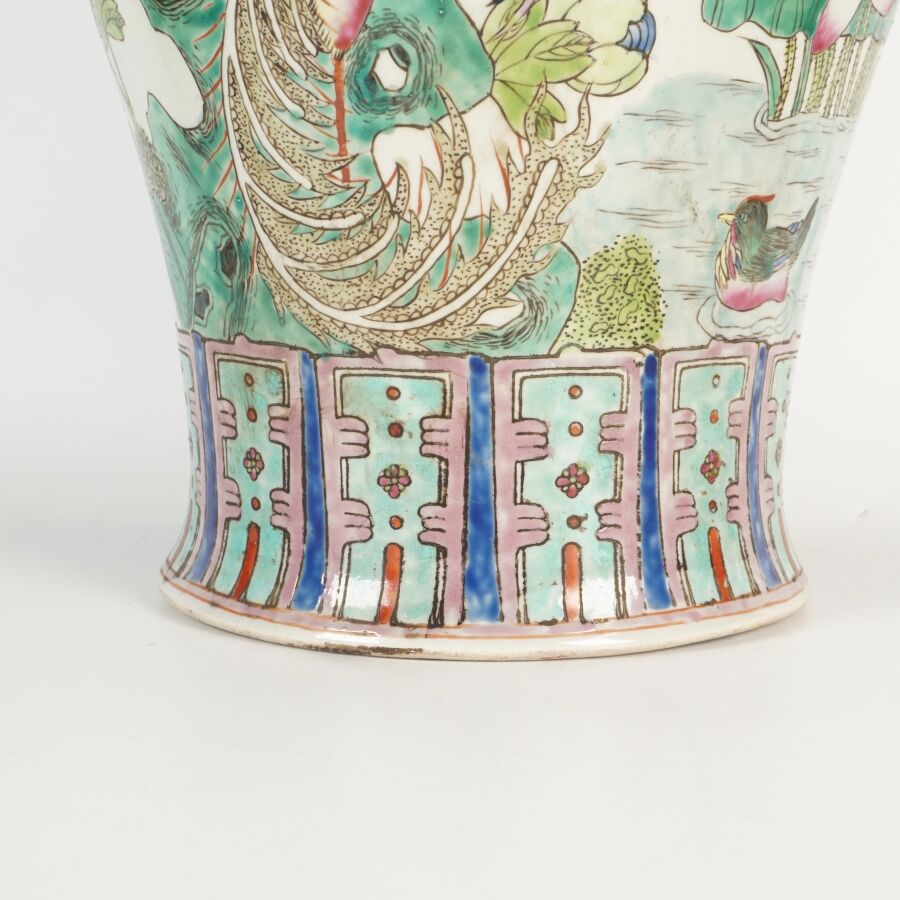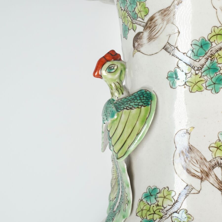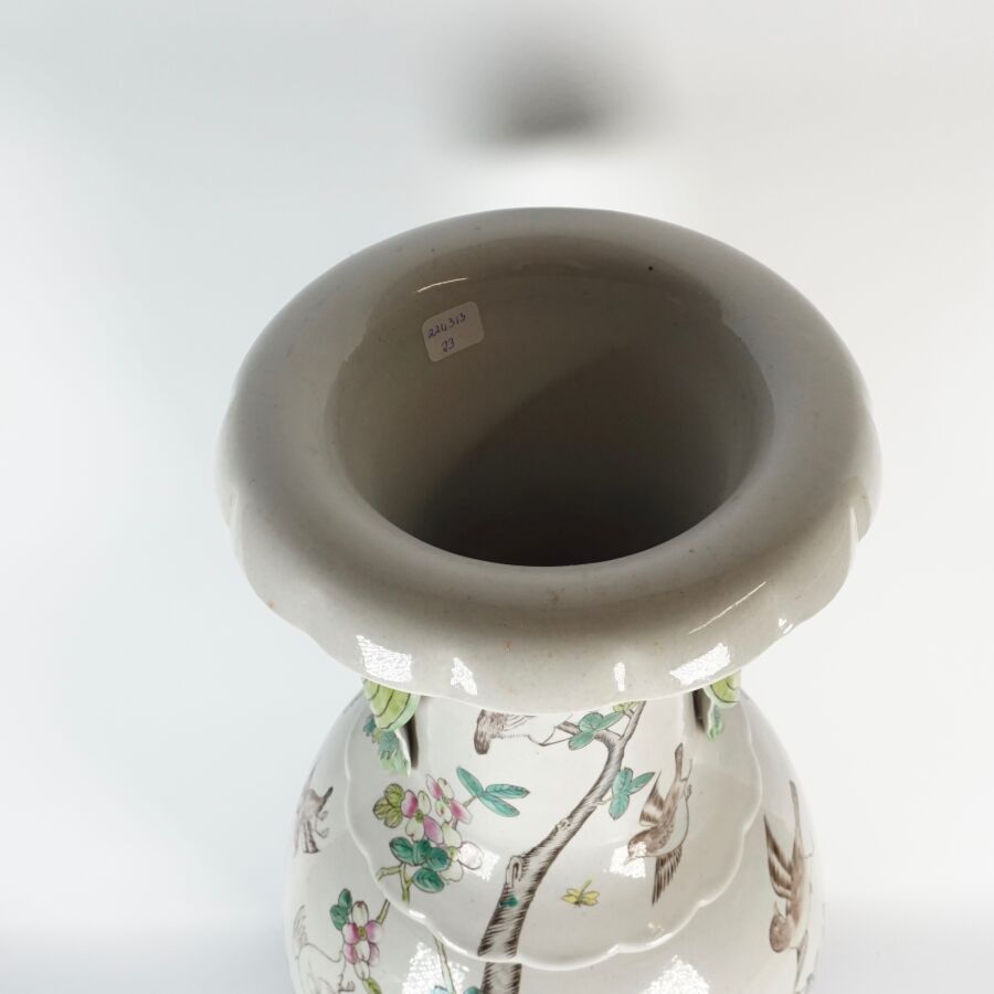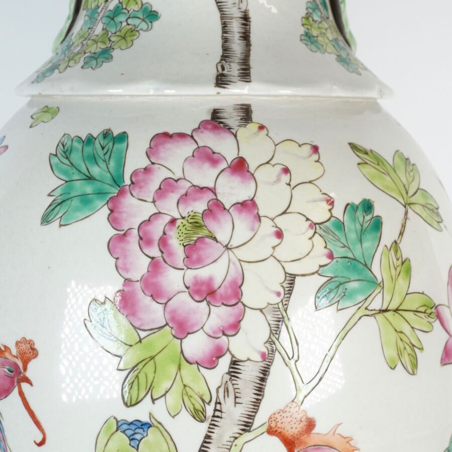 Important vase de forme balustre à col ourlé en porcelaine et émaux de style famille rose à décor de faisans et d'un couple d'oiseaux paradis perchés sur une roche, entourés de pivoines, le col orné de phenix en relief, Chine, milieu du 20ème siècle, H. 62 cm.