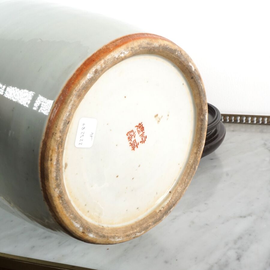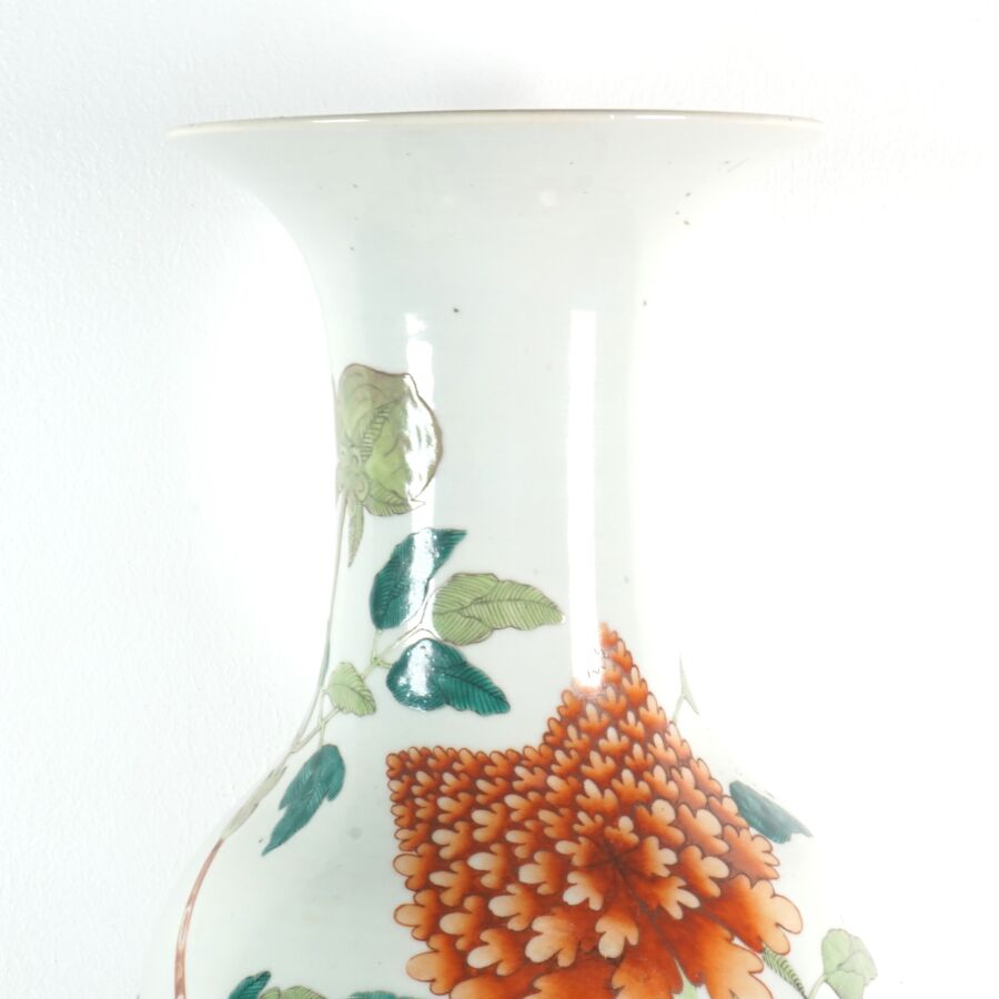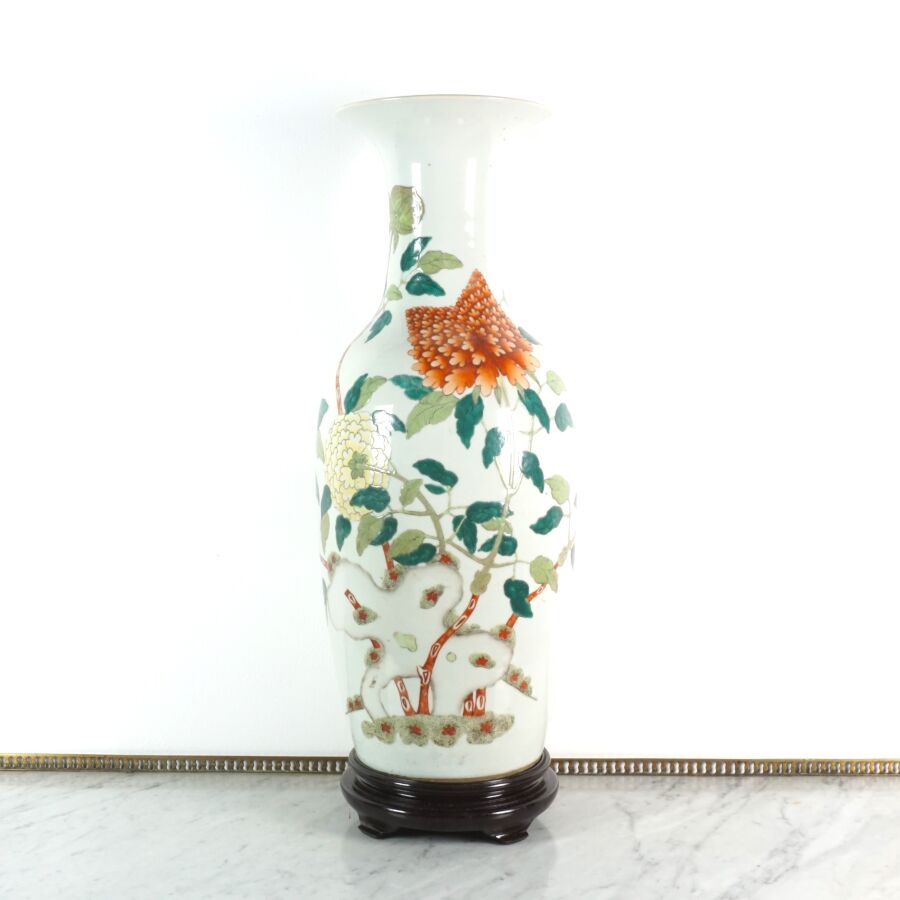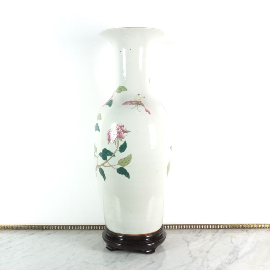 Important vase de forme balustre en porcelaine et émaux polychromes à décor de pivoines épanouies et papillon, Chine, circa 1900, H. 61 cm (petit défaut de cuisson).