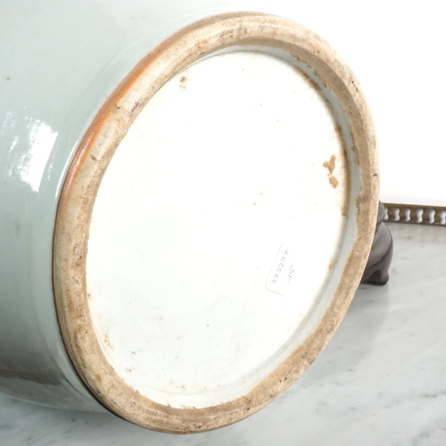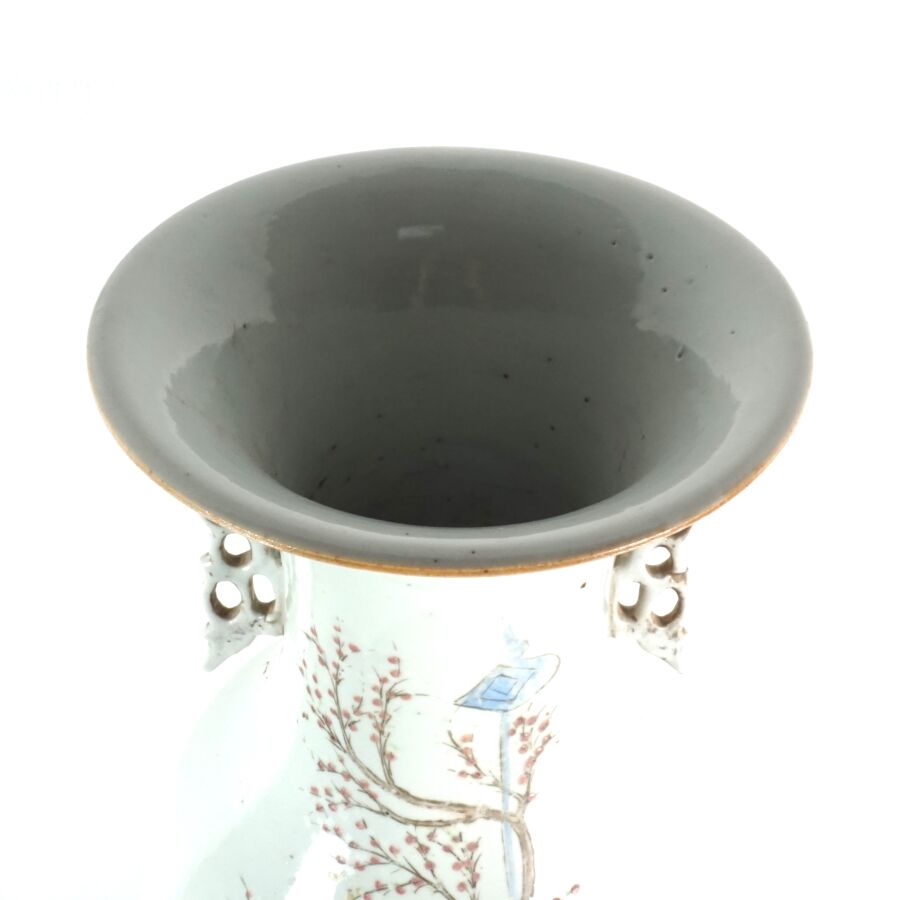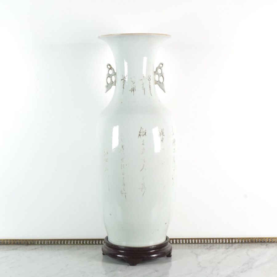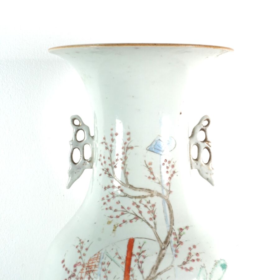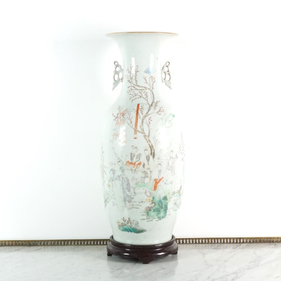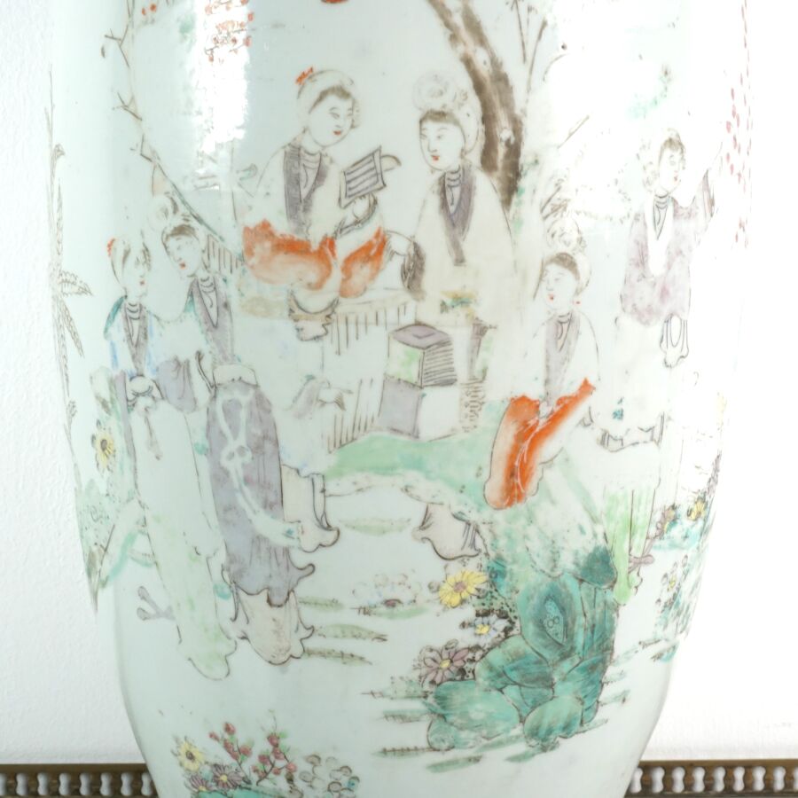 Important vase de forme balustre en porcelaine et émaux polychromes à décor d'une assemblée de jeunes femmes conversant dans un jardin fleuri, des motifs calligraphiées complètent l'ornementation, deux tiges feuillagées formant anses, Chine, circa 1900, H. 57.5 cm (usures de l'émail, éclat au col).