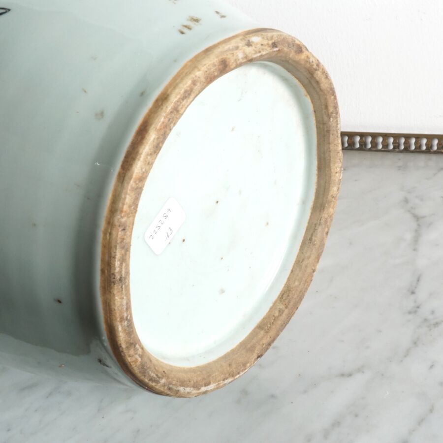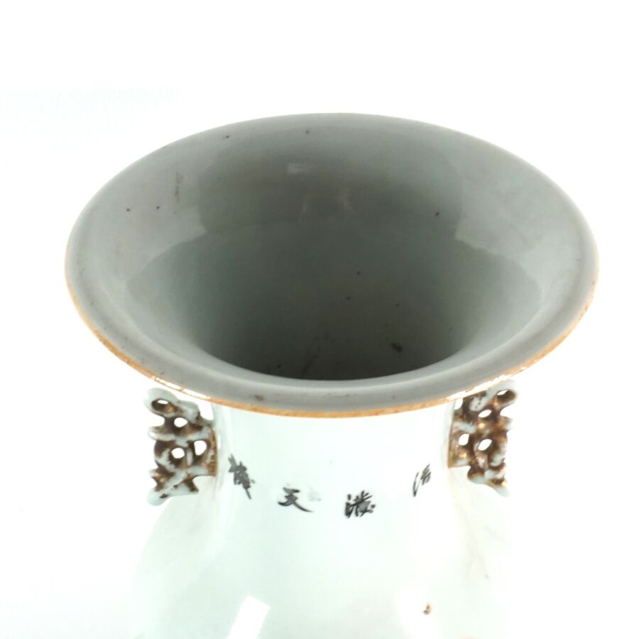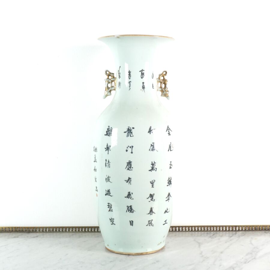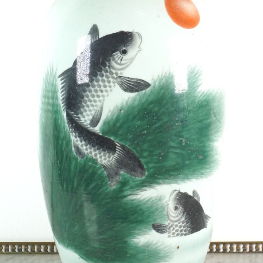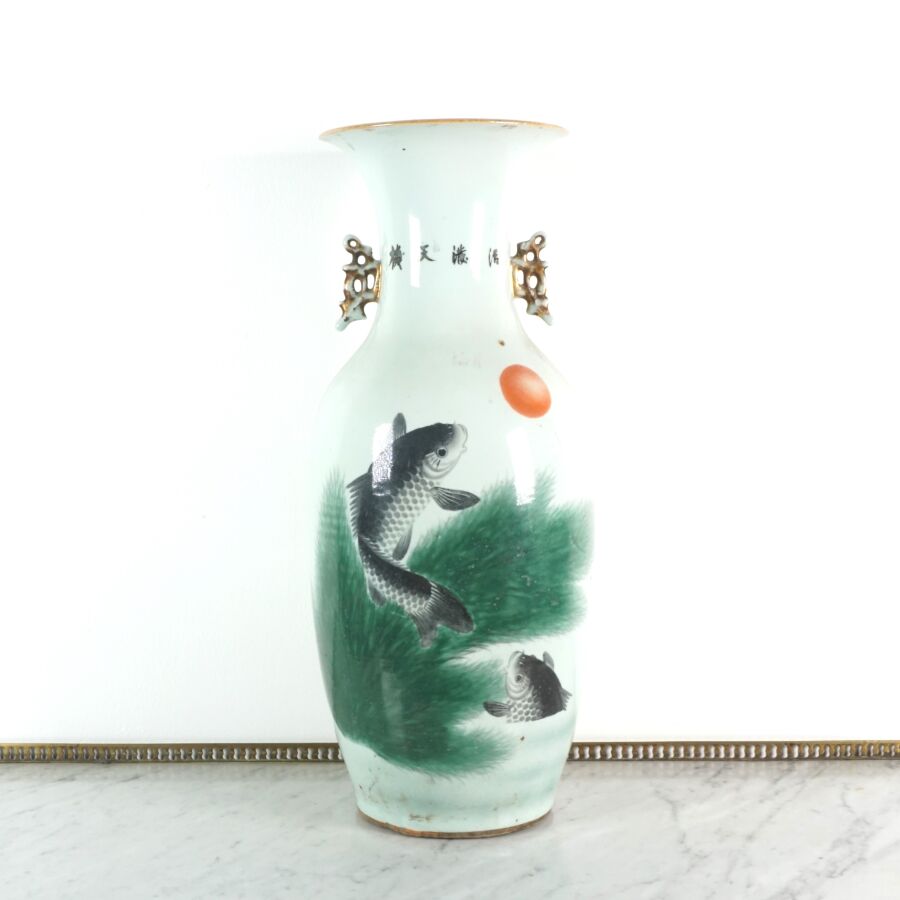 Important vase de forme balustre en porcelaine et émaux polychrome à décor de carpes émergeant de plantes aquatiques et motif calligraphiés, le col orné de deux tiges feuillagées et ajourées formant anses, Chine, circa 1900, H. 57 cm (usures et rayures, petits défauts de cuisson).