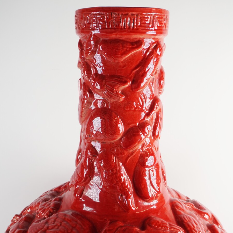 Important vase en terre vernissée émaillée rouge à décor d'animaux stylisés, Chine, 20ème siècle, H. 65 cm.