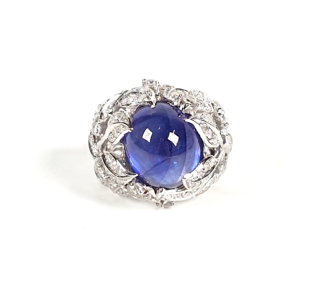 Importante bague "Dôme" en or gris (375/oo) ornée d'un saphir cabochon calibrant 13.8 cts, dans un entourage feuillagé pavé de petits diamants pesant ensemble 1 ct environ. TDD 54. Poids brut : 12.2 g environ.
