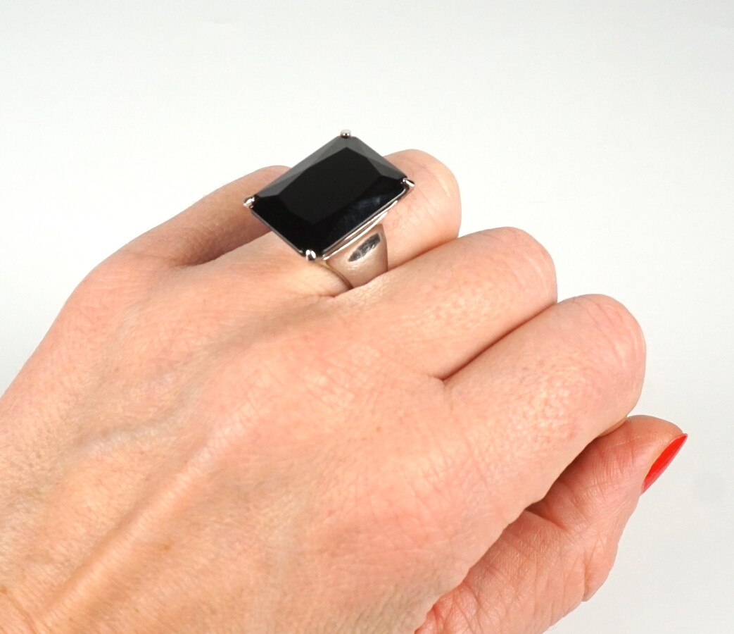 Importante bague en argent (800/oo) sertie d'une pierre noire taille rectangulaire (21 x 16 mm), probablement en résine imitant l'onyx. TDD 54. Poids brut : 16 g environ.