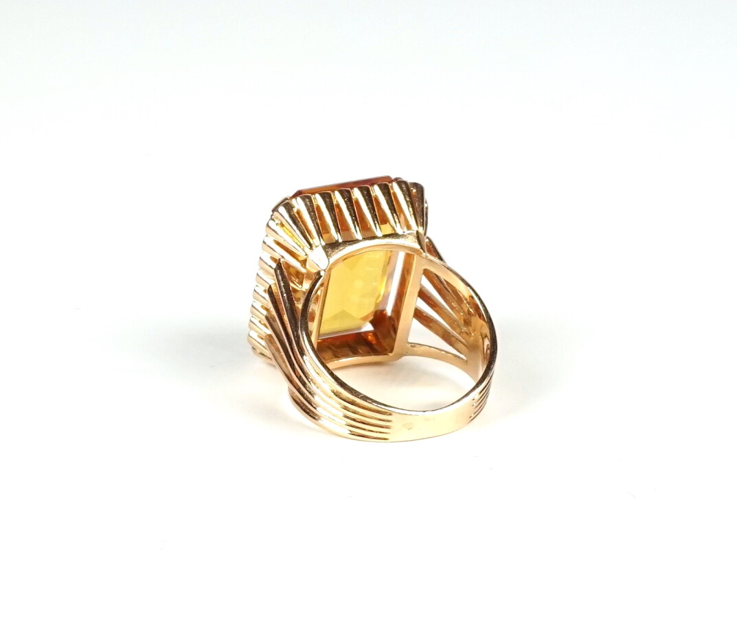 Importante bague rectangulaire en or jaune 18K (750/oo), sertie d'une pierre orangée taille émeraude, probablement une citrine (20 x 15 mm), la monture ajourée et l'anneau formé de plusieurs joncs. TDD 53. Poids brut : 12.3 g environ.