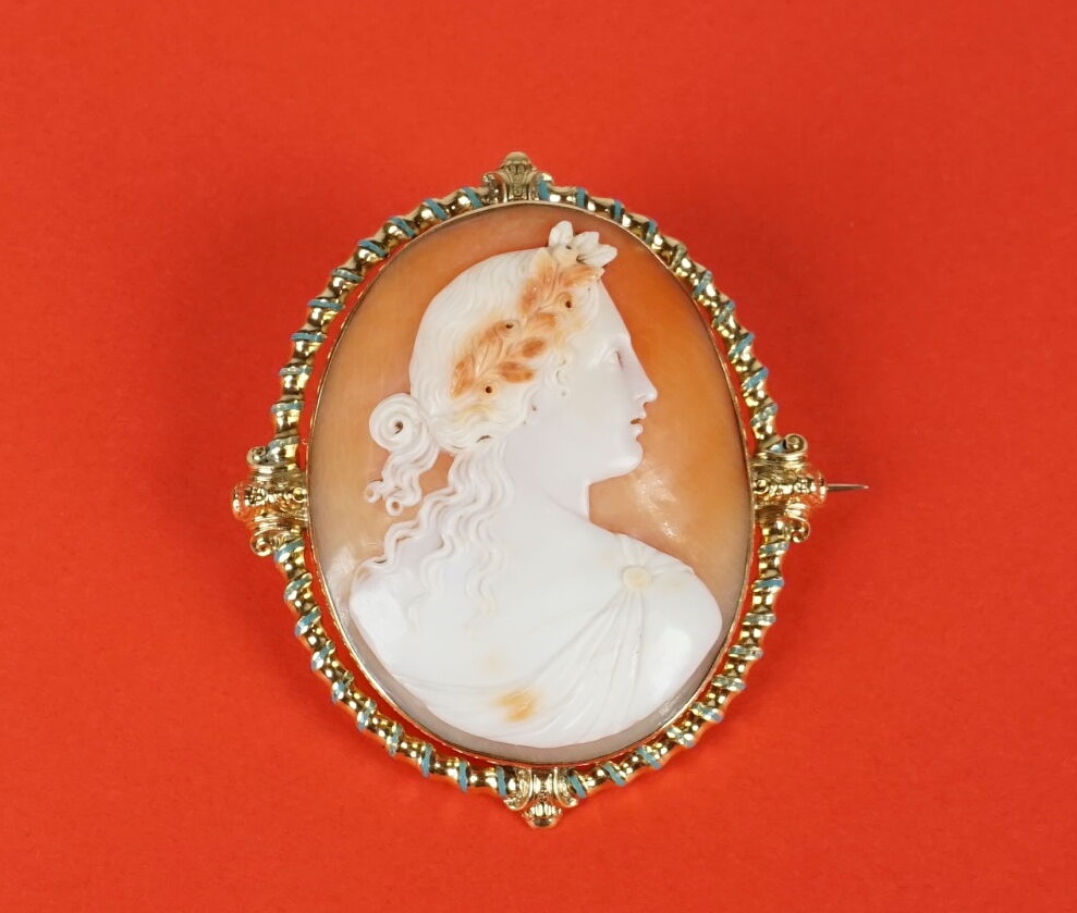 Importante broche "Camée" en or jaune 18K (750/oo), agrémentée d'un coquillage sculpté d'un profil de femme à l'antique, la monture torsadée partiellement émaillée turquoise, 5.8 x 5.1 cm. Poids brut : 13.4 g environ.