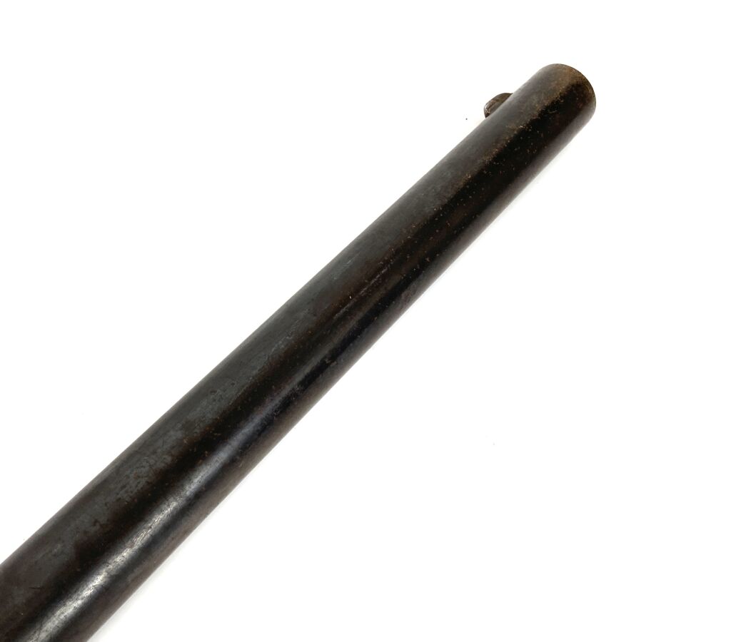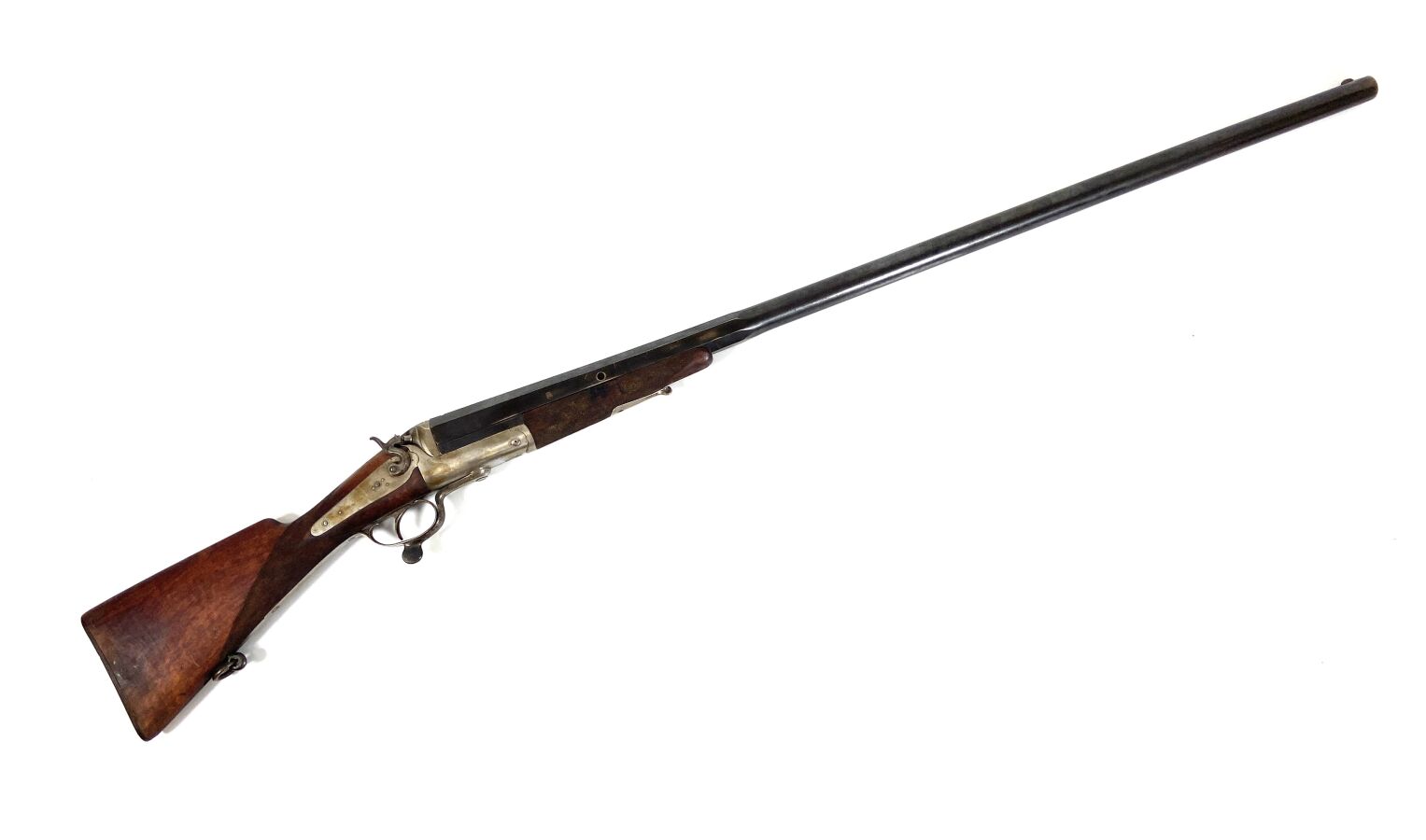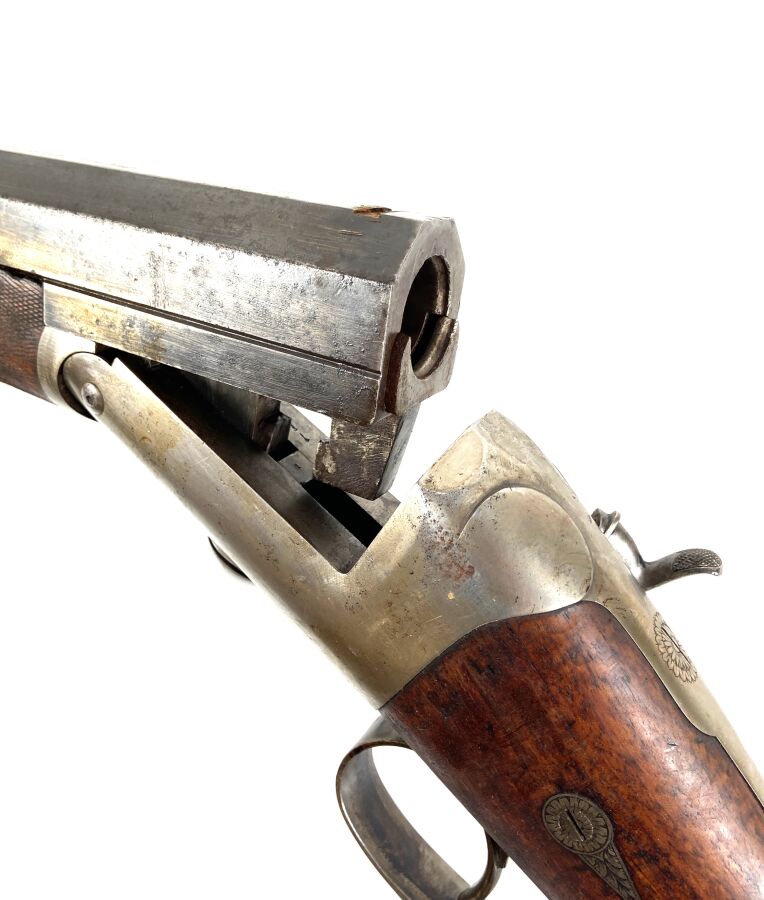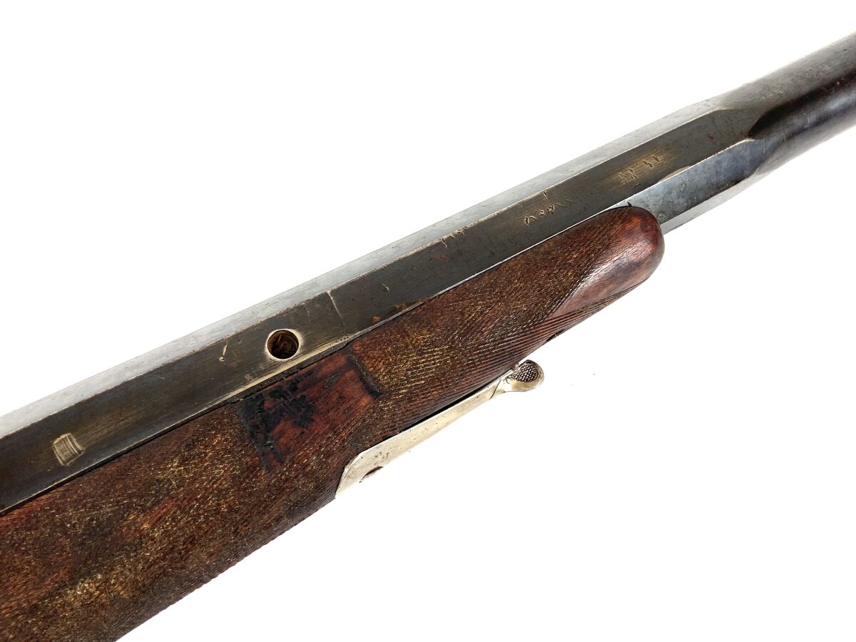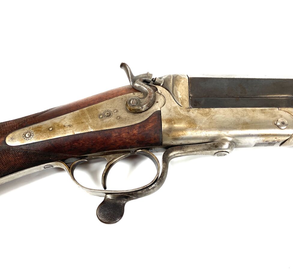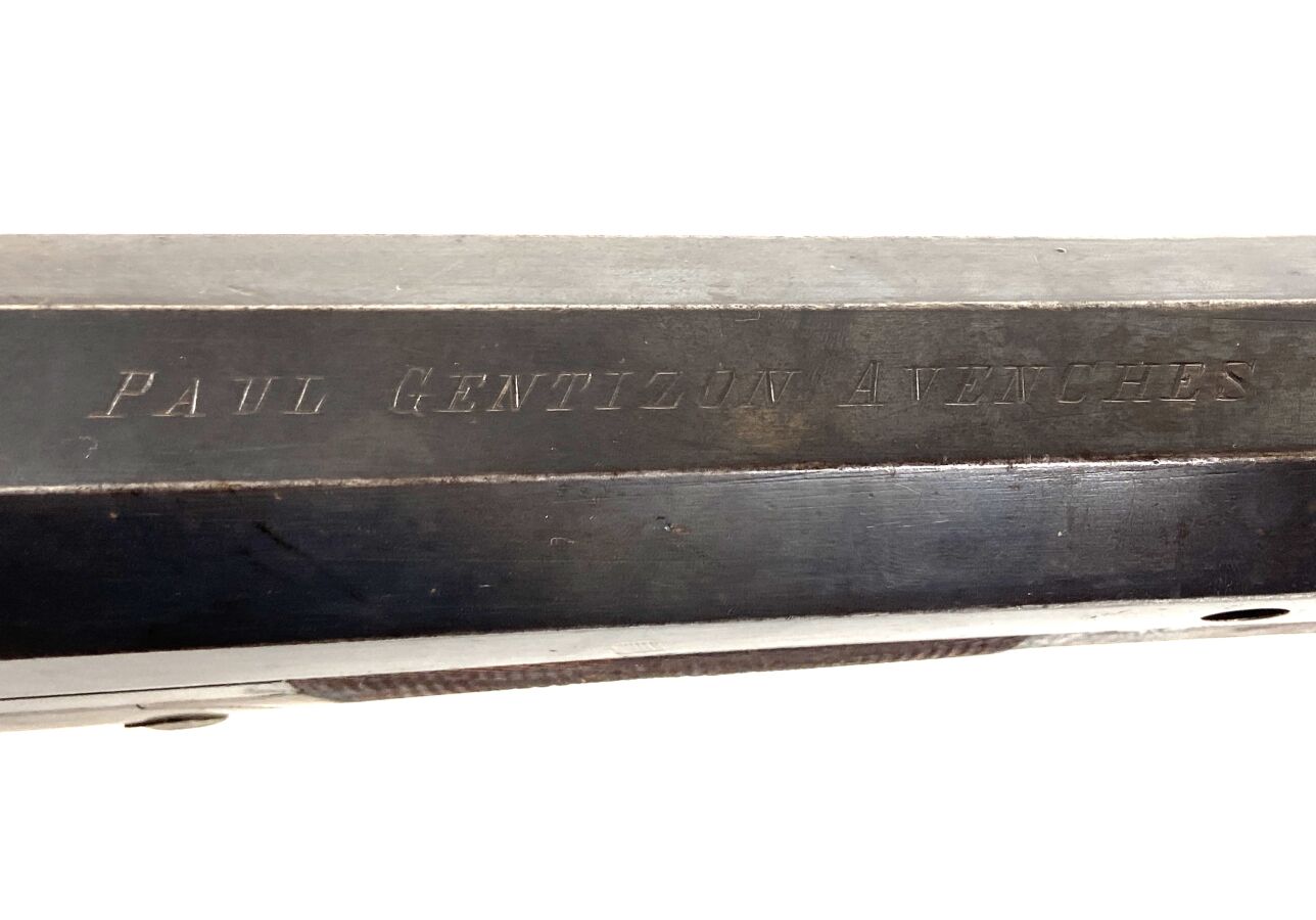 Importante CANARDIERE A PERCUSSION A CHIEN EXTERIEUR, calibre 4, extracteur, platine arrière à percussion, canon de 120 cm à pans au tonnerre, pan supérieur marqué " PAUL GENTIZON AVENCHES ", encoches pour montage sur affût, levier d'ouverture sous pontet, mécanisme semblant fonctionnel, longueur totale : 166 cm, vers 1880, BE.