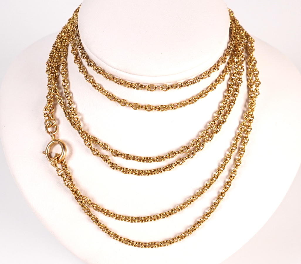 Importante chaine en or jaune 18 K (750/oo) formant sautoir ou giletière, retenant un fermoir permettant de doubler la maille, L. 156 cm. Poids brut :19.8 g environ.