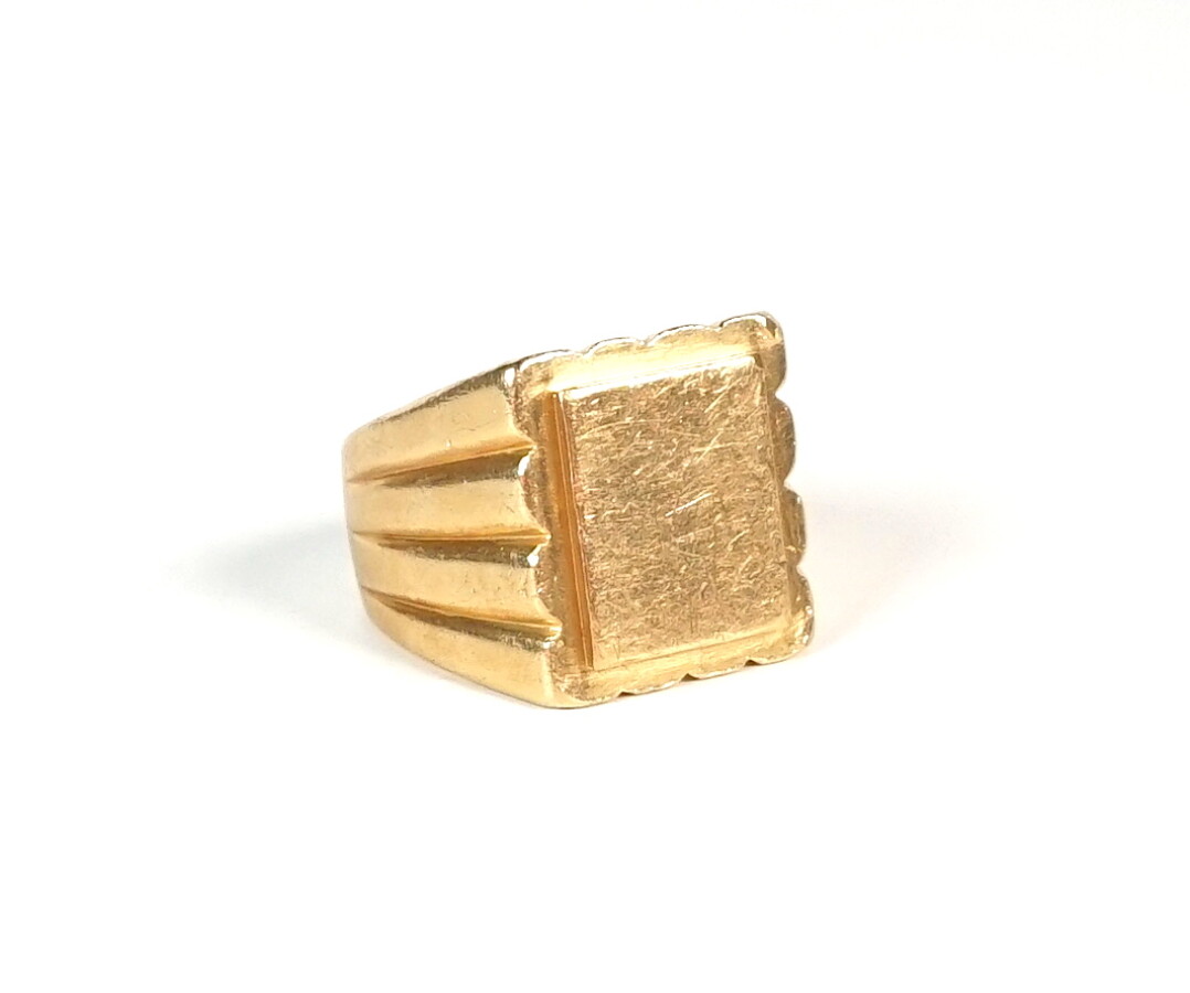 Importante chevalière en or jaune 18 K (750/oo), non chiffrée (fissure partie inférieure de l'anneau). TDD 57. Poids brut : 24.2 g environ.