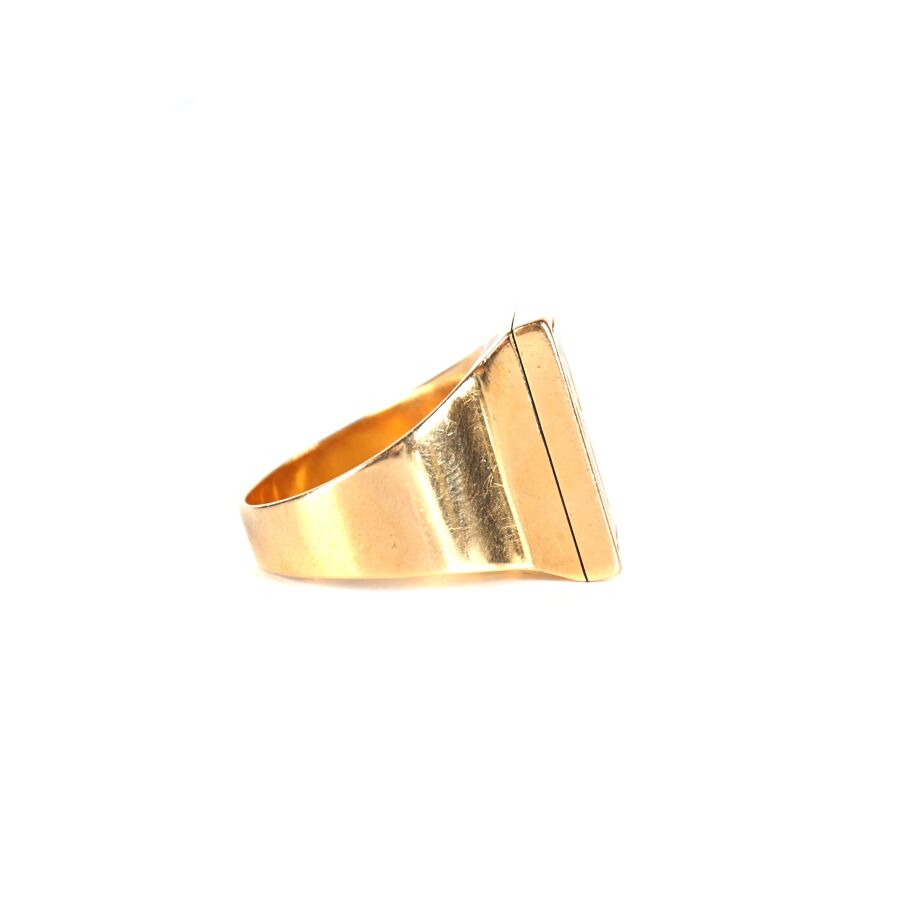 Importante chevalière en or jaune 18K (750/oo), le plateau de forme rectangulaire ornée des initiales "JG" en bas-relief sur fond noir, TDD. 69. Dim. Plateau : 2.2 x 1.2 cm. Poids brut : 15 g environ (infimes accroc sur le fond).