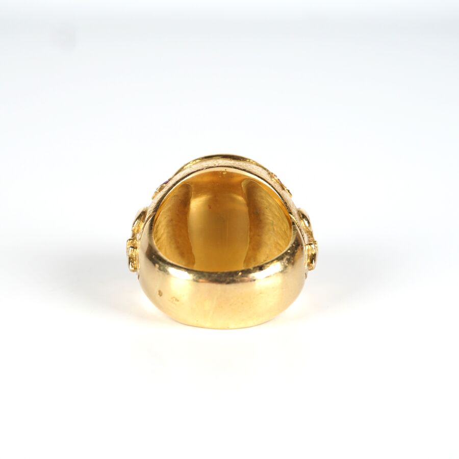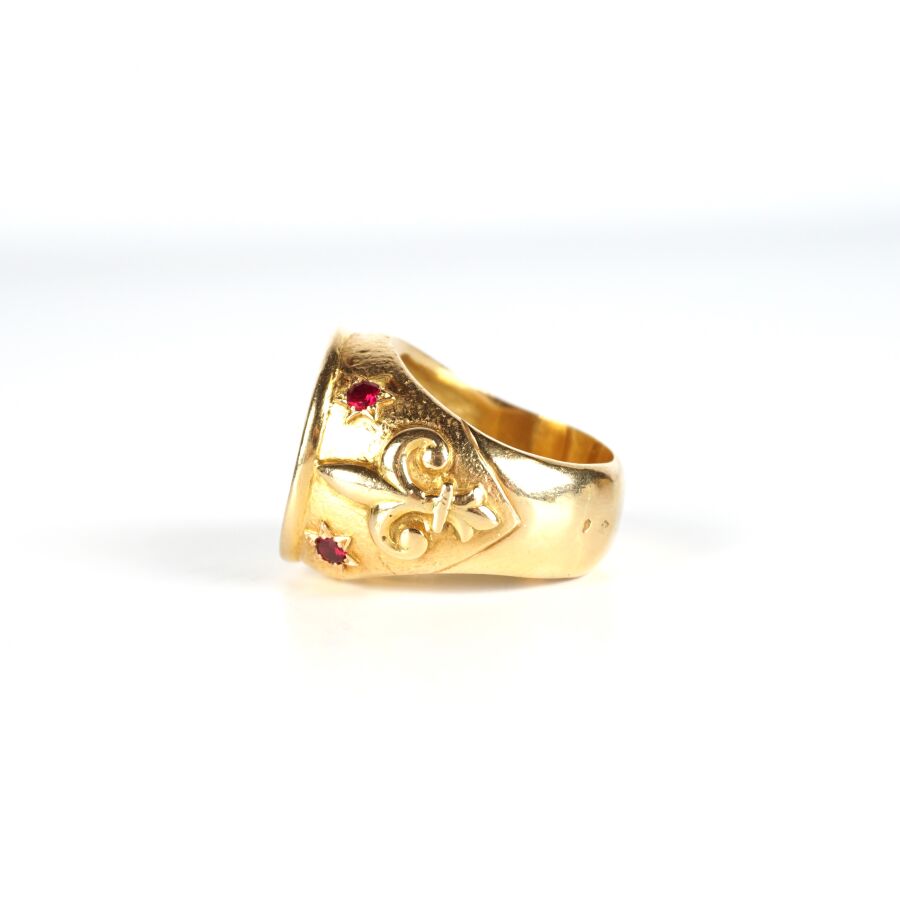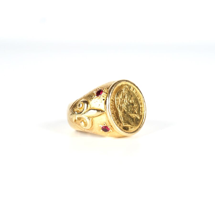 Importante chevalière "Monnaie" en or jaune 18K (750/oo), le plateau serti clos d'une monnaie 20 francs or Napoléon III, les montants ornés chacun d'une fleur de lys encadrée de 2x2 rubis facettés ronds calibrant 0.15 cts chacun (D. 3 mm),TDD. 67.5/68. Poids brut : 64 g environ.