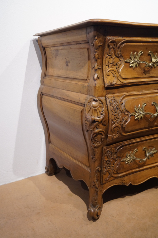 Importante commode tombeau lyonnaise ou de la vallée du Rhône en noyer, galbée toutes faces, ouvrant à trois tiroirs en façade, richement moulurée et sculptée de coquilles, feuilles d'acanthe, branches feuillagées et chutes de culots feuillagés, traverse inférieure mouvementée, plateau en bois naturel, garniture de bronzes dorés et ciselés tels que entrées de serrure et mains fixes à décor de coquilles et feuillages, elle repose sur 4 petits pieds à enroulements, 18e siècle, 135 x 66 x H. 100 cm (bronzes probablement rapportés, parties anciennes et remontages).