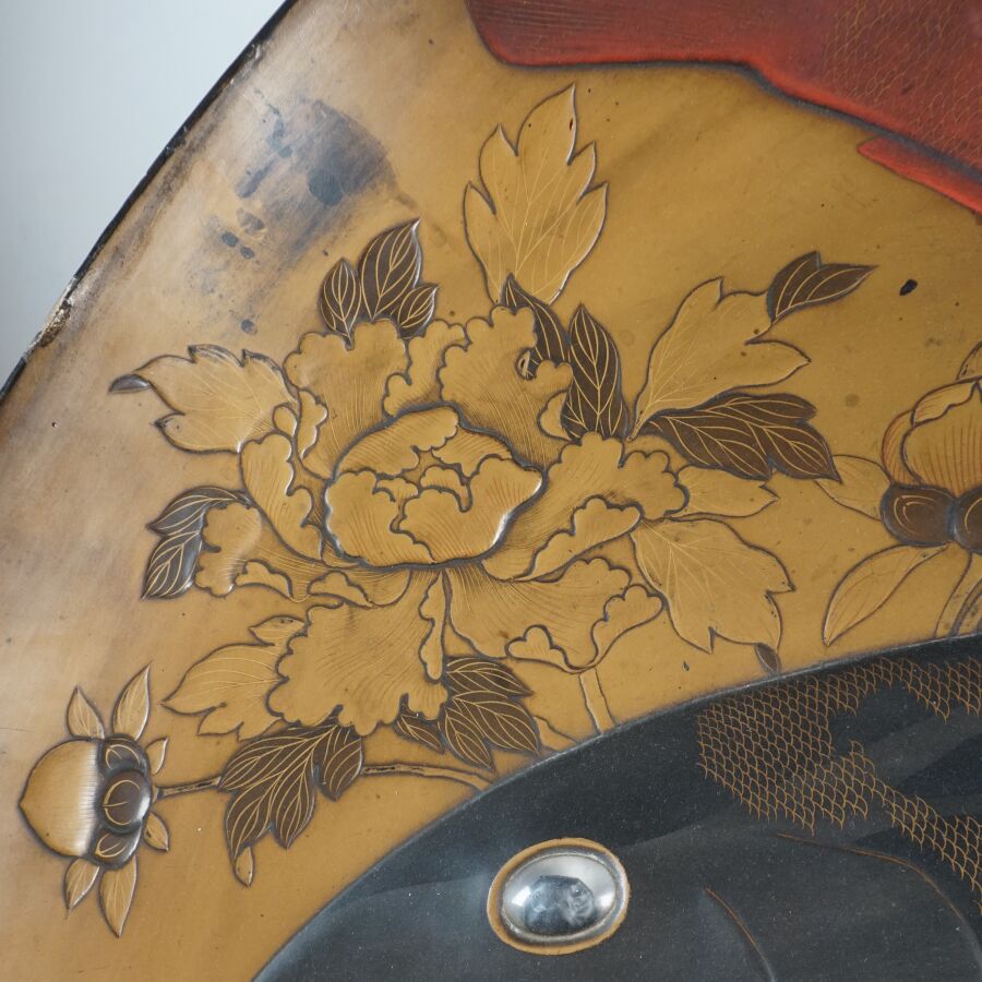 Importante coupe de mariage sur piédouche finement décorée d'une bonite, dorade et rouget laqués en relief en camaïeu de brun - rouge, reposant sur un fond or orné de fleurs de pivoines en relief, les yeux en sulfure, porte la signature Matsutsuru Sai au revers, Japon, Période Meiji, Diam. 64.5 cm. H. 19 cm (quelques légers éclats en bordure et petites restaurations).