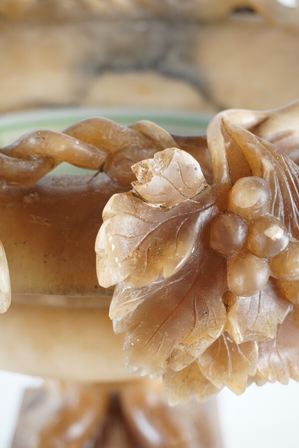 Importante coupe sur socle en pierre dure et placage de pierre dure, probablement de la stéatite (?), la coupe richement ornée sur le bord de ceps de vignes et de feuillages entrelacés reposant sur quatre dauphins, montée sur un socle carré, fin du 19e - début du 20e siècle, H. 45 cm. L. Coupe : 48 cm (manques, éclats et accidents).
