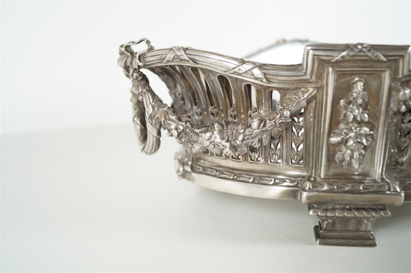 Importante jardinière ajourée en argent, poinçon Minerve, à décor de médaillons perlés retenant des guirlandes fleuries surmontés d'un noeud "Marie-Antoinette", de frises de feuilles d'eau, les prises latérales formant des joncs enrubannées, le fond en métal argenté, 47.5 x 30 x H. 13.5 cm (manque une petite anse au fond désargenté). Poids brut : 2 680 g environ.