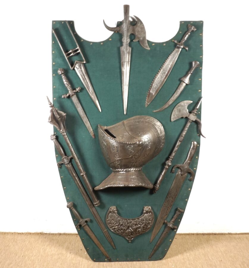 Importante PANOPLIE D'ARMES DE STYLE HAUTE-EPOQUE, certaines simple face, dimensions du panneau en bois : 123 x 75 cm, BE.