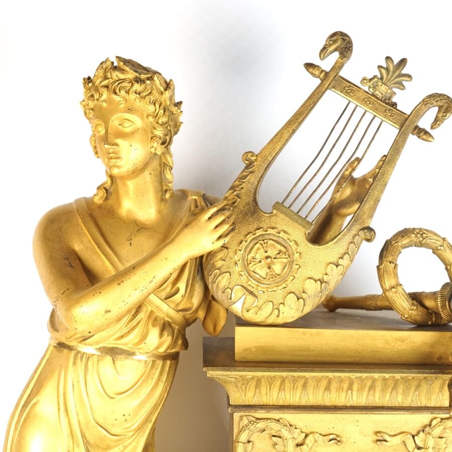 Importante pendule à poser en bronze doré figurant Apollon à sa lyre accoudé à une borne recevant le cadran, fond en métal doré ciselé, chiffres romaines pour les heures, index pour les minutes, signé "Lahoussaye" et surmonté d'une couronne de laurier et d'une torche enflammée, reposant sur un socle rectangulaire orné en bas-relief d'une guirlande et feuillage et de gui, quatre pieds à enroulement ornés de têtes de bélier, début du 19ème siècle, probablement d'époque Empire, avec son balancier, H. 71 cm. L. 42 cm. Larg. 15 cm (petites usures à la patine, signature et chiffres partiellement effacés).