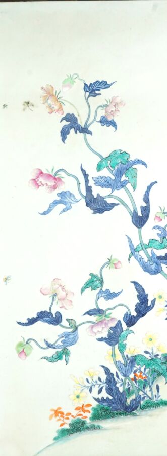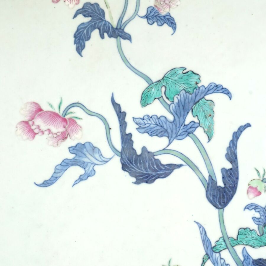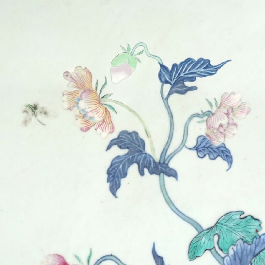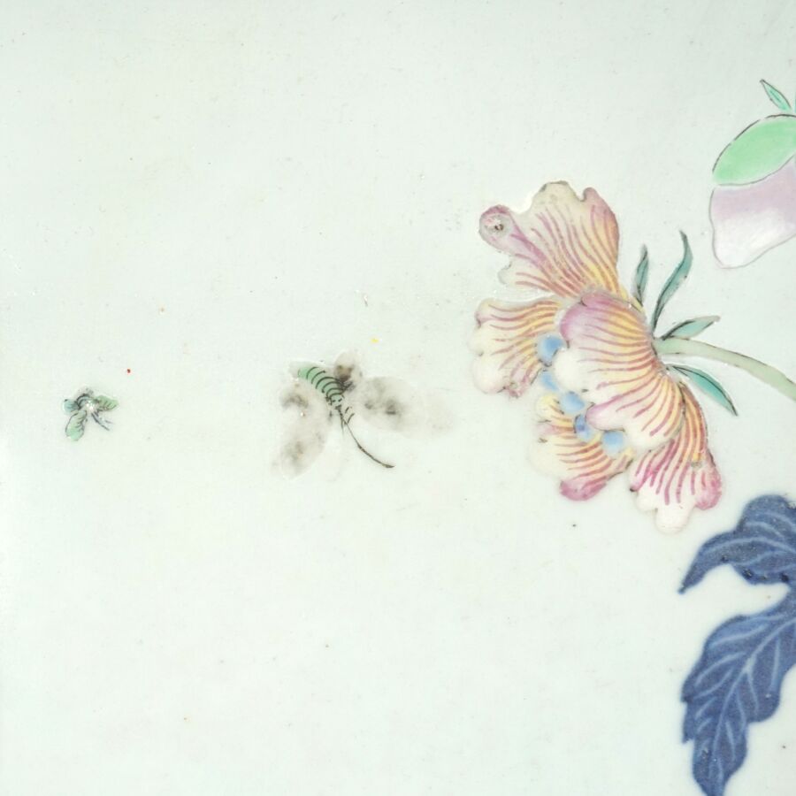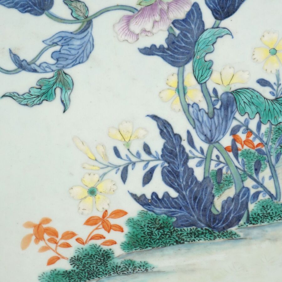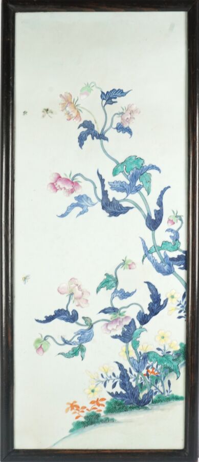 Importante plaque rectangulaire en porcelaine émaillée blanche à décor doucai de fleurs et papillons, Chine, époque Qing, Dim. 57.7 x 23 cm. (accidents et restauration sur la partie supérieure).