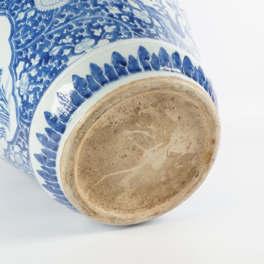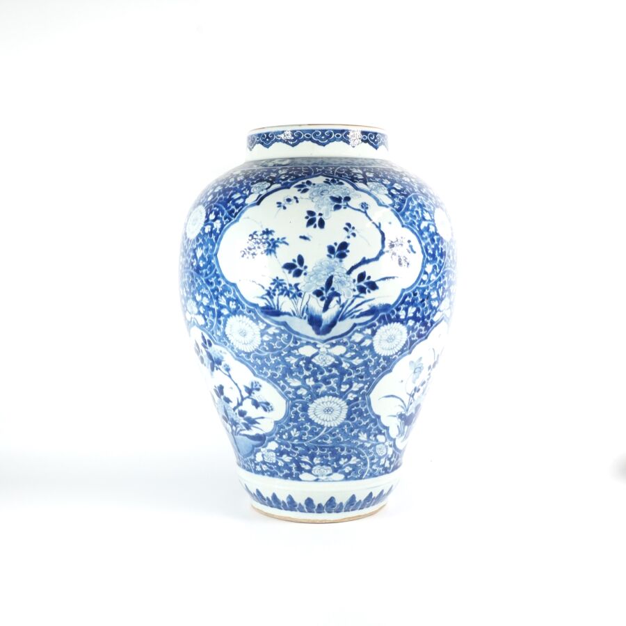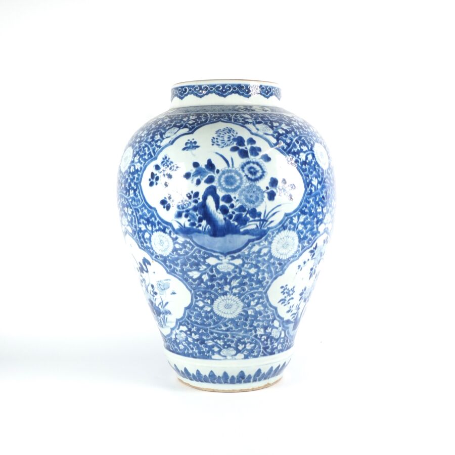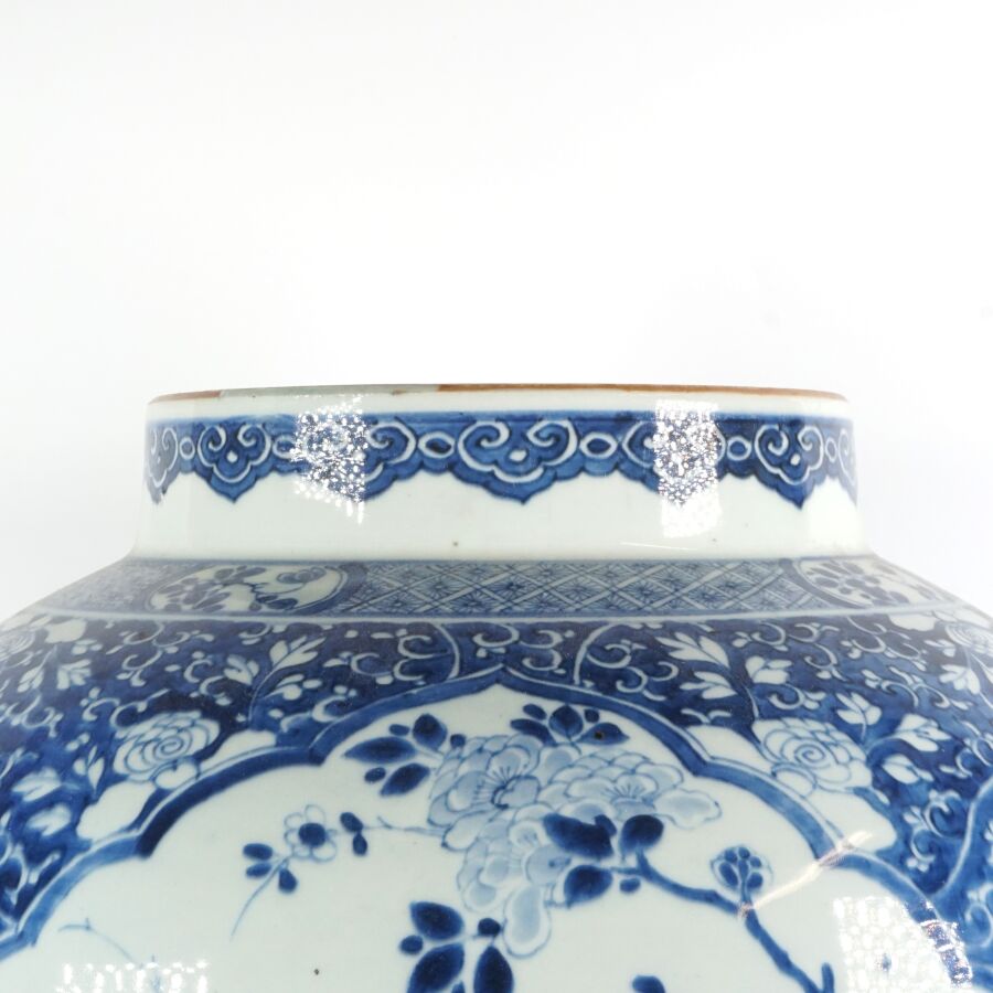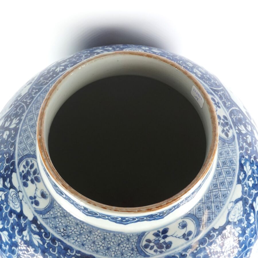 Importante potiche de forme balustre, en porcelaine émaillée blanche, à décor en bleu sous couverte en médaillons, de fleurs de lotus et pivoines sur fond de fleurs de chrysanthèmes. Une guirlande de têtes de ruyi complète l'ornementation du pourtour du col, Chine, 18ème siècle, H. 48,5 cm (sans couvercle, quatre fêles à l'intérieur dont trois étoilés, fêles sur le pourtour du col).