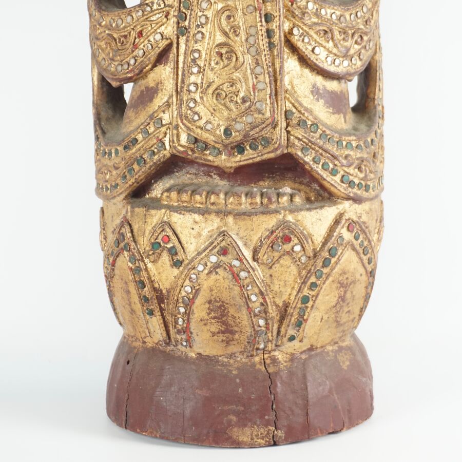 Importante sculpture, bois laqué rouge et or, à décor d'incrustations de verroteries polychromes, représentant un adorant en offrande, debout sur son lotus, paré de son costume traditionnel, Birmanie, seconde moitié du 20ème siècle, H. 86 cm (fente).