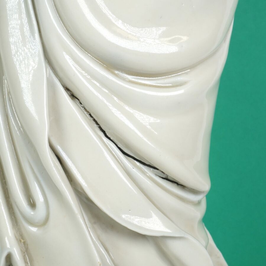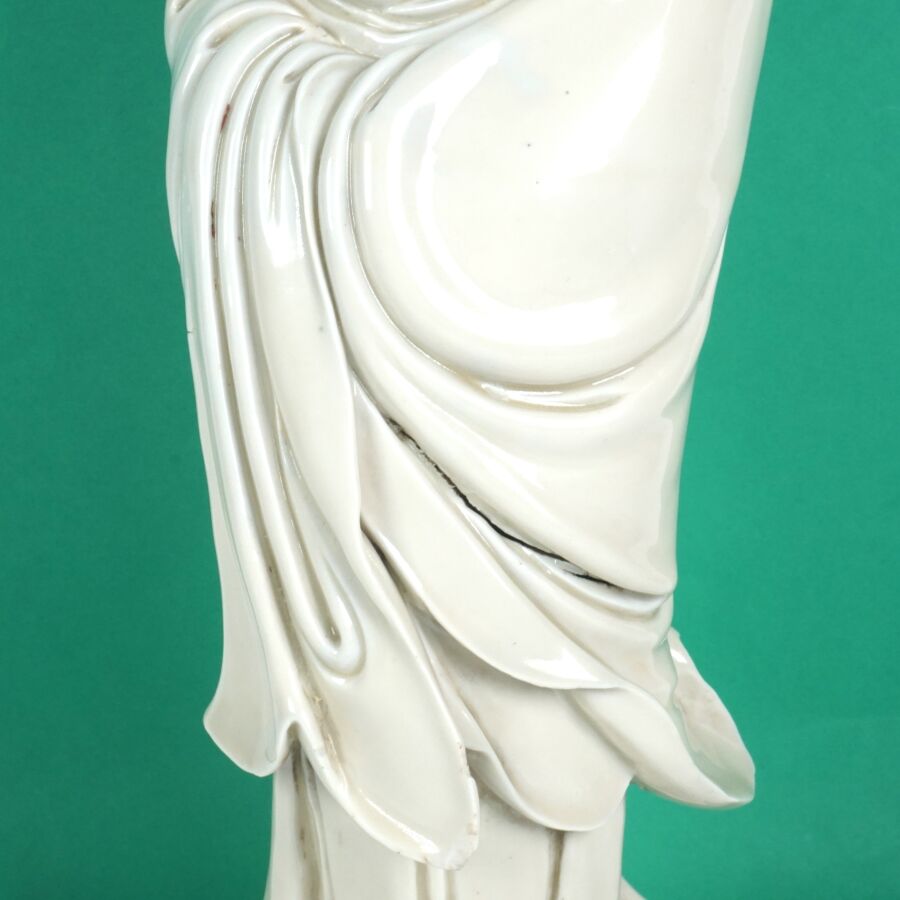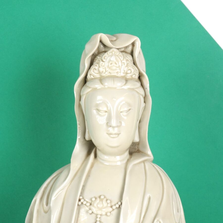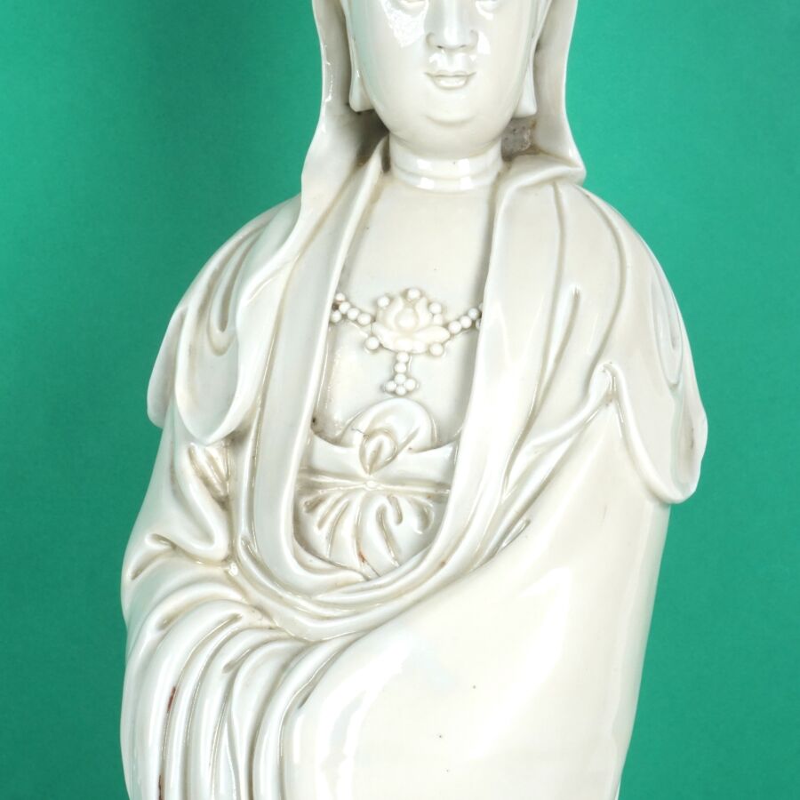 Importante statuette en porcelaine dite Blanc de Chine représentant la divinité Guanyin arborant un collier et la réminiscence d'Amitabha, Chine, fin du 19ème siècle, H. 45.6 cm (fente et accident).