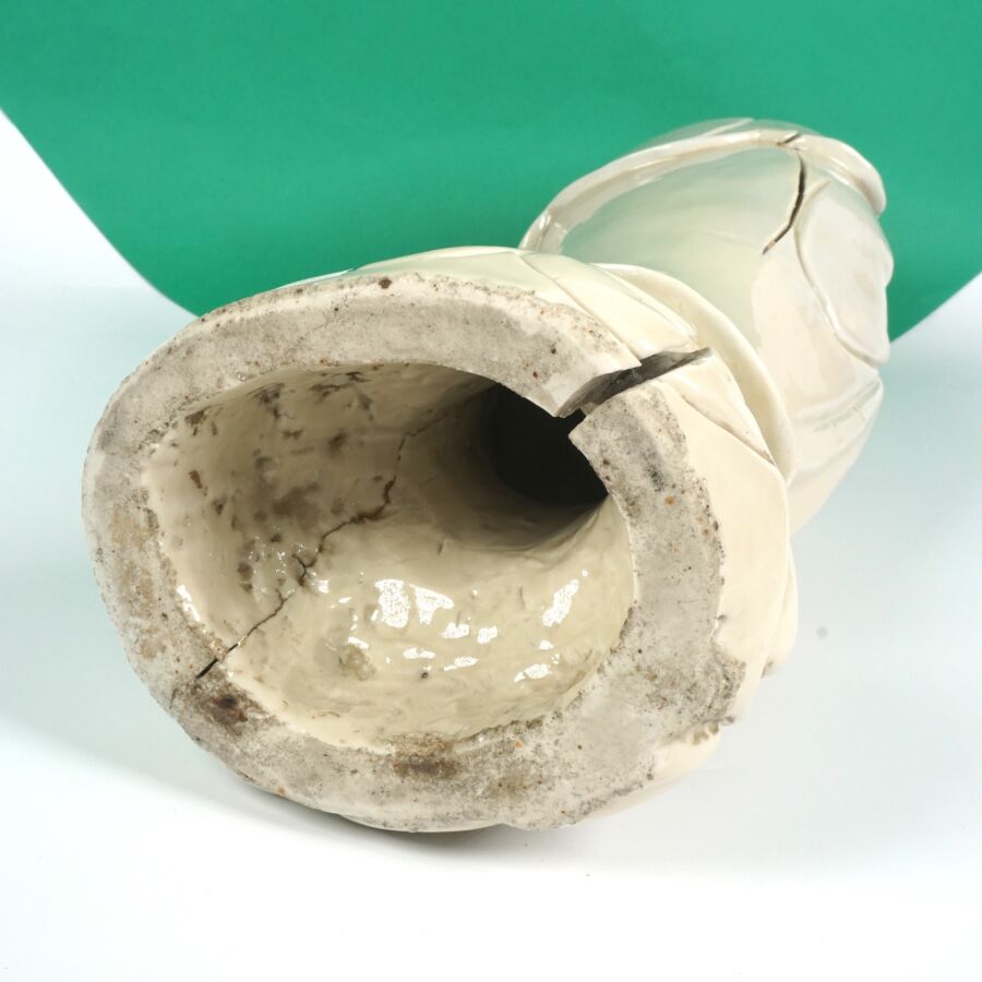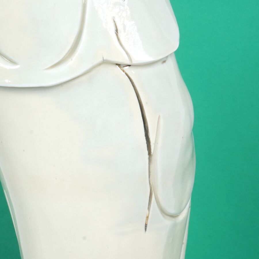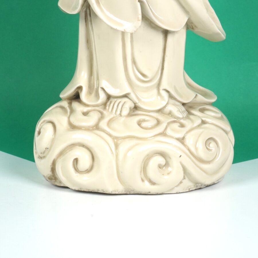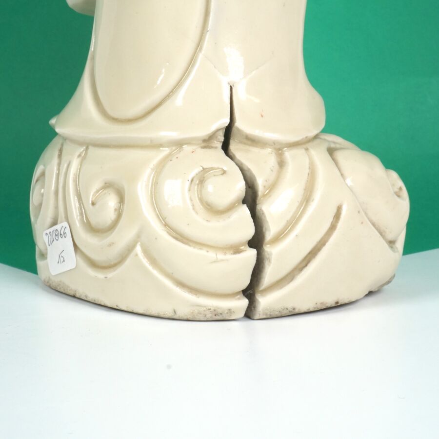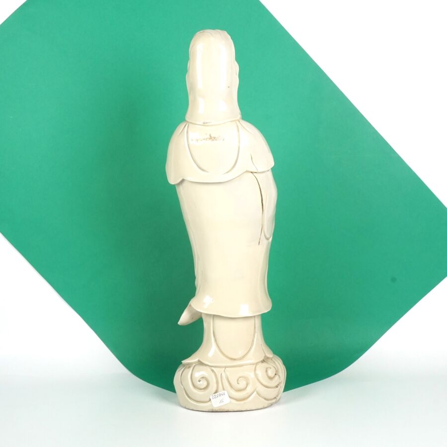 Importante statuette en porcelaine dite Blanc de Chine représentant la divinité Guanyin arborant un collier et la réminiscence d'Amitabha, Chine, fin du 19ème siècle, H. 45.6 cm (fente et accident).