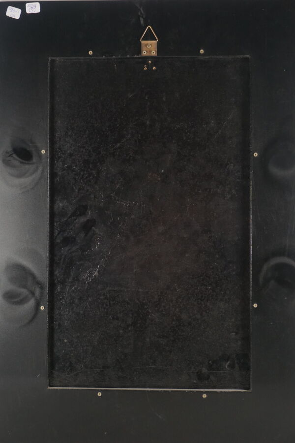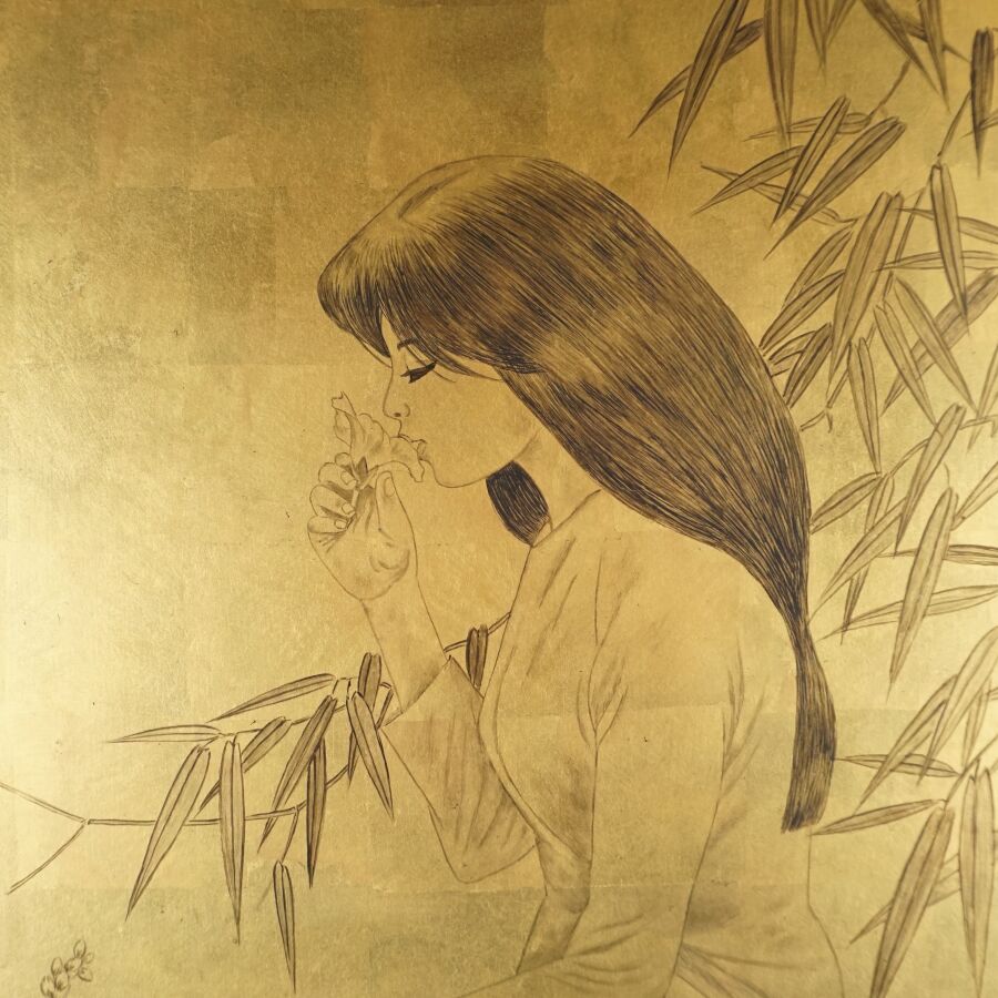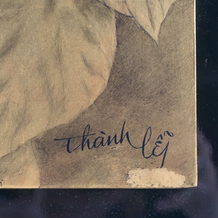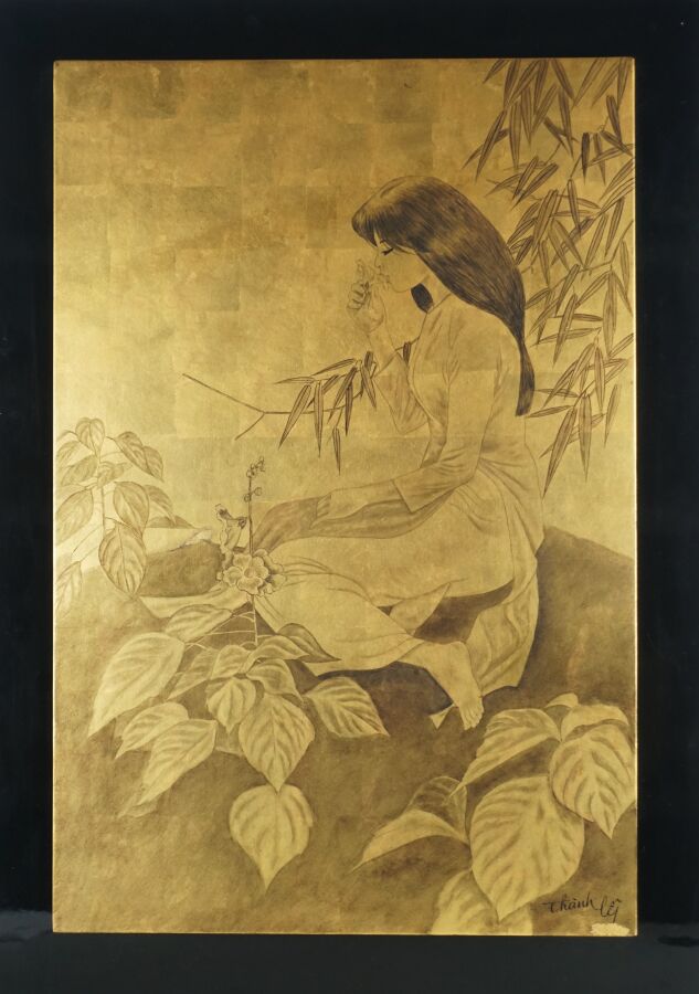 Impression occidentale sur panneau en laque noire à décor en noir sur fond or d'une jeune femme à l'orchidée, porte une signature en bas à droite Thanh Ley, Vietnam, travail moderne, Dim. 60 x 40 cm (légères rayures d'usage).