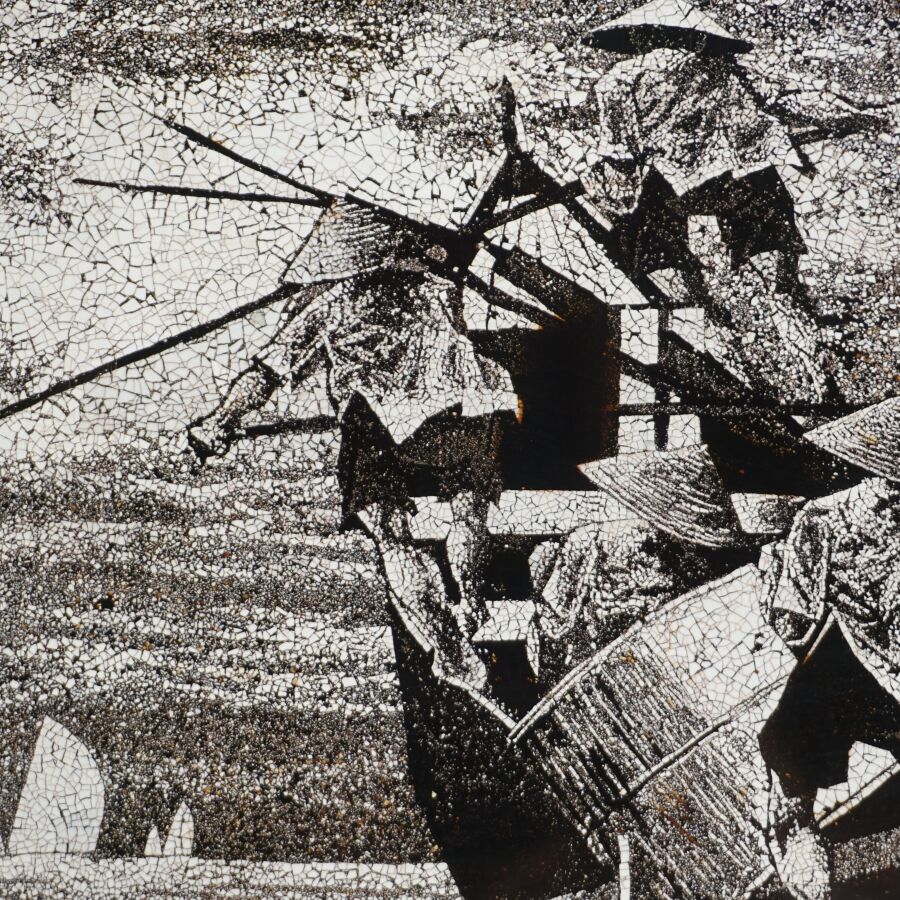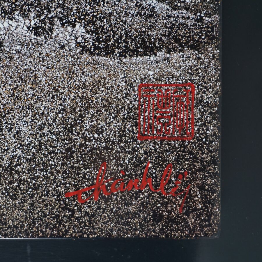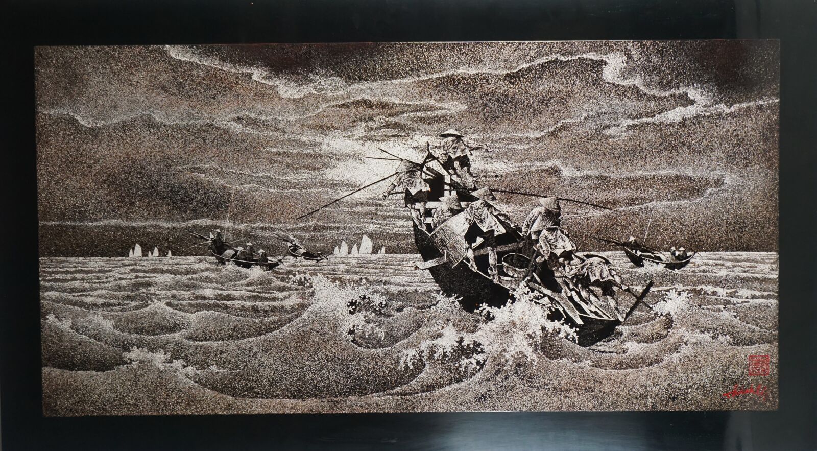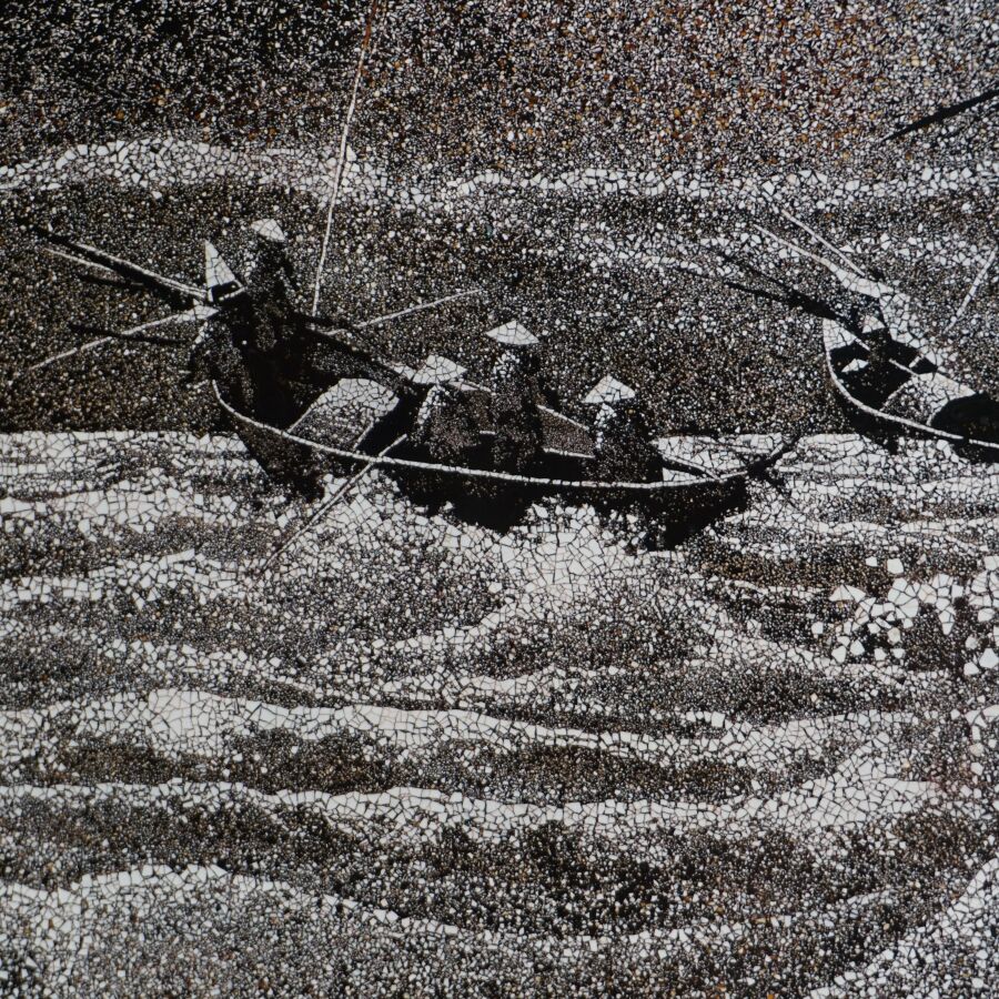 Impression occidentale sur panneau en laque noire à décor en noir et blanc à l'imitation de la coquille d'oeuf de pêcheurs dans des flots écumants, porte une signature en bas à droite Thanh LEY et cachet d'atelier, Vietnam, travail moderne, Dim. 50 x 100 cm.