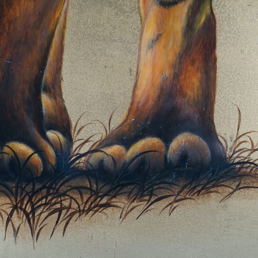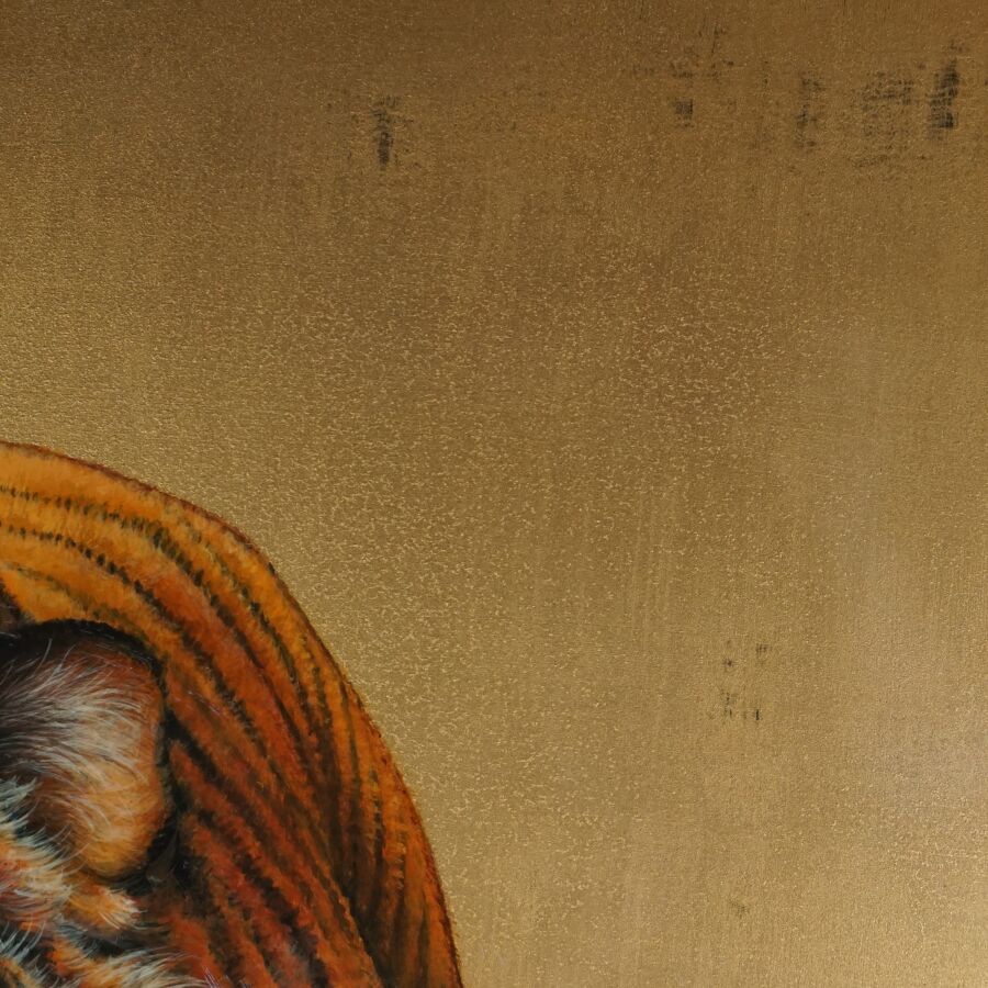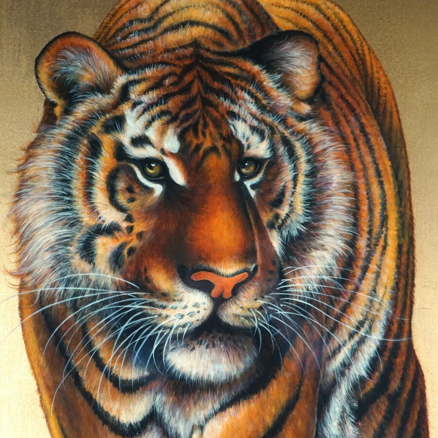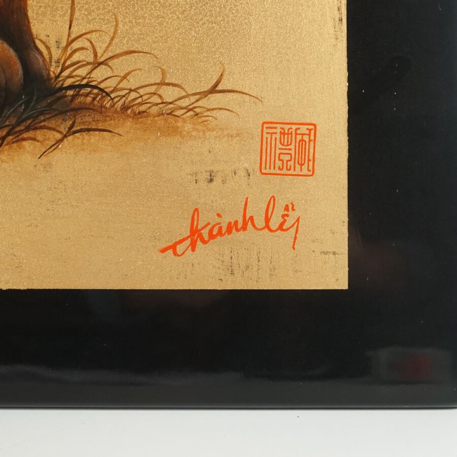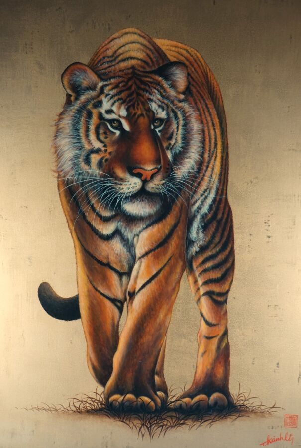 Impression occidentale sur panneau en laque noire à décor d'un tigre sur fond or, porte une signature en bas à droite Thanh LEY et cachet d'atelier, Vietnam, travail moderne, Dim. 110 x 80 cm.