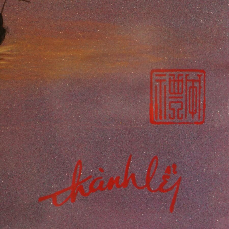Impression occidentale sur panneau en laque noire à décor polychromes de jonques sur la baie d'Along au coucher du soleil, porte une signature en bas à droite Thanh LEY et cachet d'atelier, Vietnam, travail moderne, Dim. 29,8 x 39,7 cm.