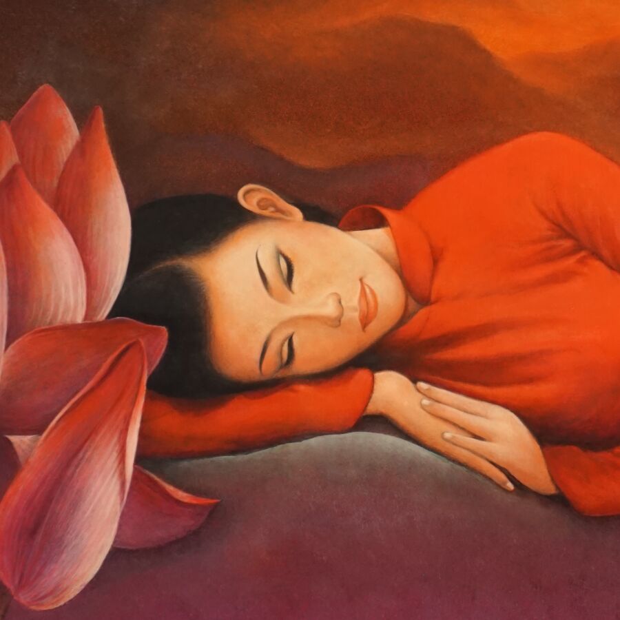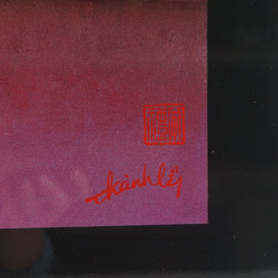 Impression occidentale sur panneau en laque noire à décor polychromes d'une femme en costume traditionnelle rouge au repos, porte une signature en bas à gauche Thanh LEY et cachet d'atelier, Vietnam, travail moderne, Dim. 55 x 50 cm.