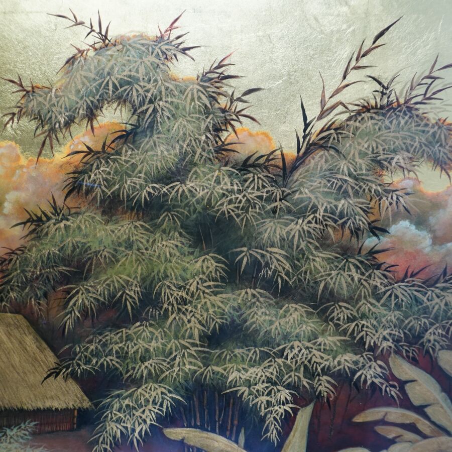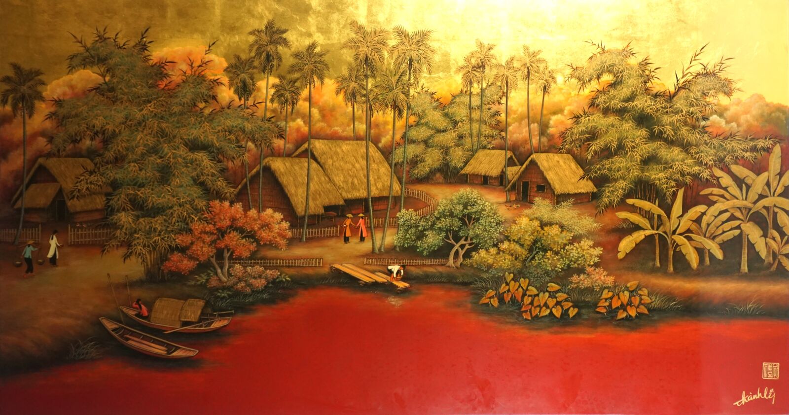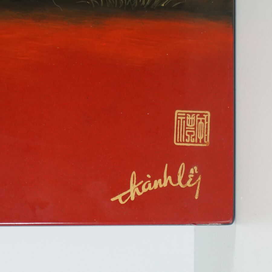 Impression occidentale sur panneau en laque noire à décor polychromes sur fond or de jeunes villageoises et retour des pêcheurs dans des embarcations dans une végétation luxuriante, porte une signature en bas à droite Thanh LEY et cachet d'atelier, Vietnam, travail moderne, Dim. 69,5 x 130 cm.