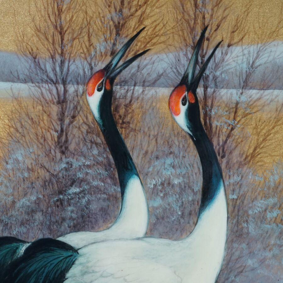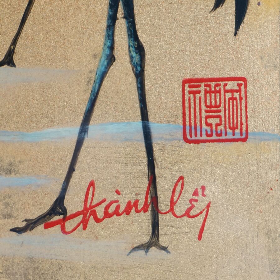 Impression occidentale sur panneau occidentale en laque noire à décor polychromes de grues, porte une signature en bas à droite Thanh LEY et cachet d'atelier, Vietnam, travail moderne, Dim. 50 x 70 cm.