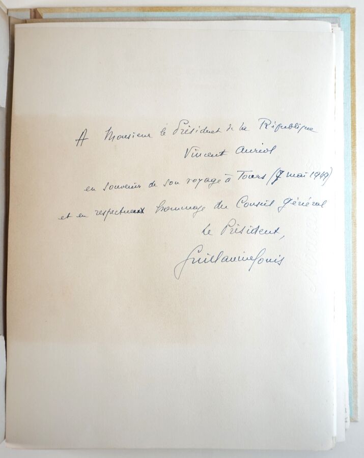 [INDRE-ET-LOIRE] - DUBREUIL (Ferdinand) - Ensemble de 2 volumes grand In-4° -Chinon - 1935 - Loches vieille cité des rois - 1947 - En feuilles, le 1er sous chemise titrée or au dos et emboîtage (1er et dernier feuillets brunis), le 2nd sous couverture rempliée illustrée, chemise titrée or au dos et emboîtage, emboîtage commun - Très nombreuses gravures originales numérotées et signées au crayon de Ferdinand Dubreuil - Le 2nd ouvrage numéroté (263/300) sur vélin teinté du Marais avec envoi autographe signé du Président du Conseil Général Sébastien Paul Guillaume-Louis : " A Monsieur le Président de la république Vincent Auriol en souvenir de son voyage à Tours (7 mai 1949) et en respectueux hommage du Conseil Général. "