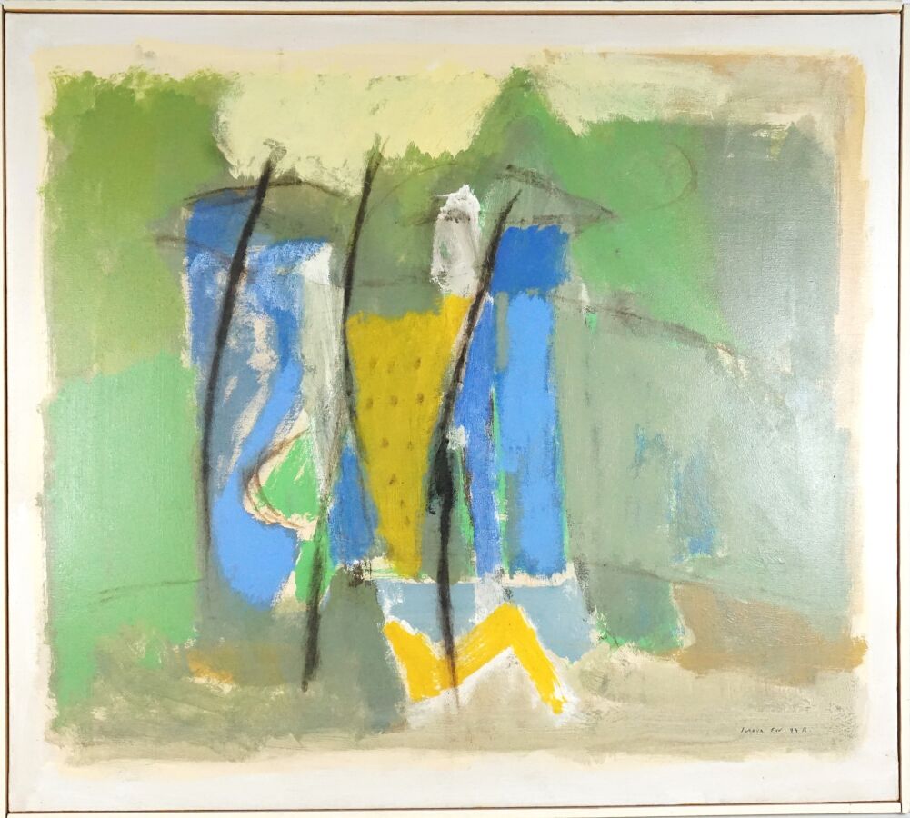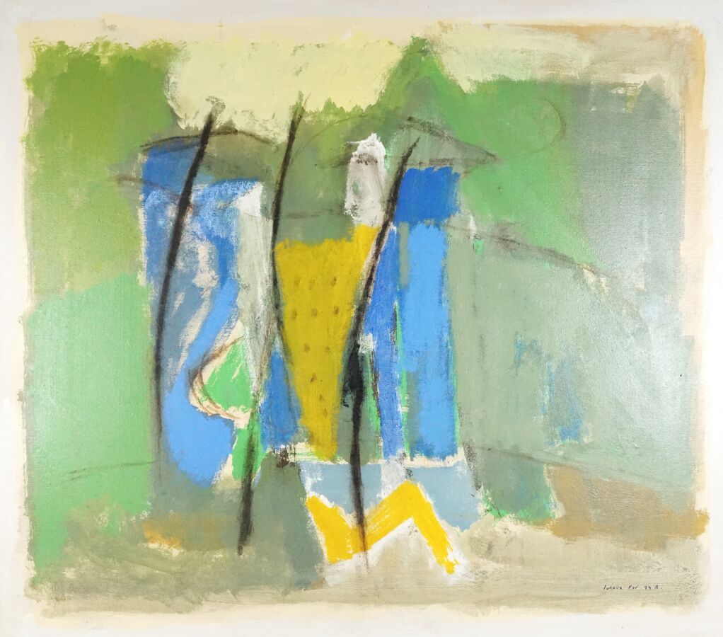 INOUX (XXe), "Landscape signs" 1994, huile sur toile signée et datée en bas à droite, contresignée, datée et titrée au dos, 78.5 x 88.5 cm.