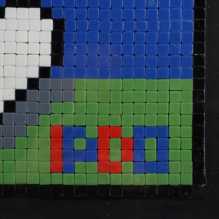 IPDO (XXe), "Flower's Power Smurf - Flower Smurf-Thrower", mosaïque originale composée de carreaux émaux micro-briare 0.9 x 0.9 cm, exemplaire unique, 47 x 48 cm.