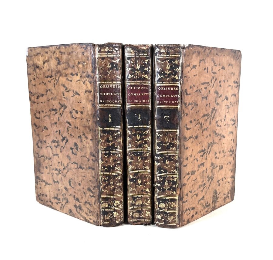ISOCRATE - OEuvres complèttes [sic], auxquelles on a joint quelques discours analogues à ceux de cet orateur, tirés de Platon […] traduites en françois par M. l'Abbé Auger […] - Paris ; de Bure, Théoph. Barrois jeune, 1781 - 3 volumes In-8° - Marges des titres cernées - Reliure de l'époque veau havane marbré (3 mors partiellement fendus, quelques coins émoussés) - Dos lisses ornés et tomés or (des dédorures et épidermures, coiffes accidentées ou élimées) - Pièces de titre maroquin bordeaux - Tranches rouges - Cachet ex-libris humide couronné répété aux 3 volumes.