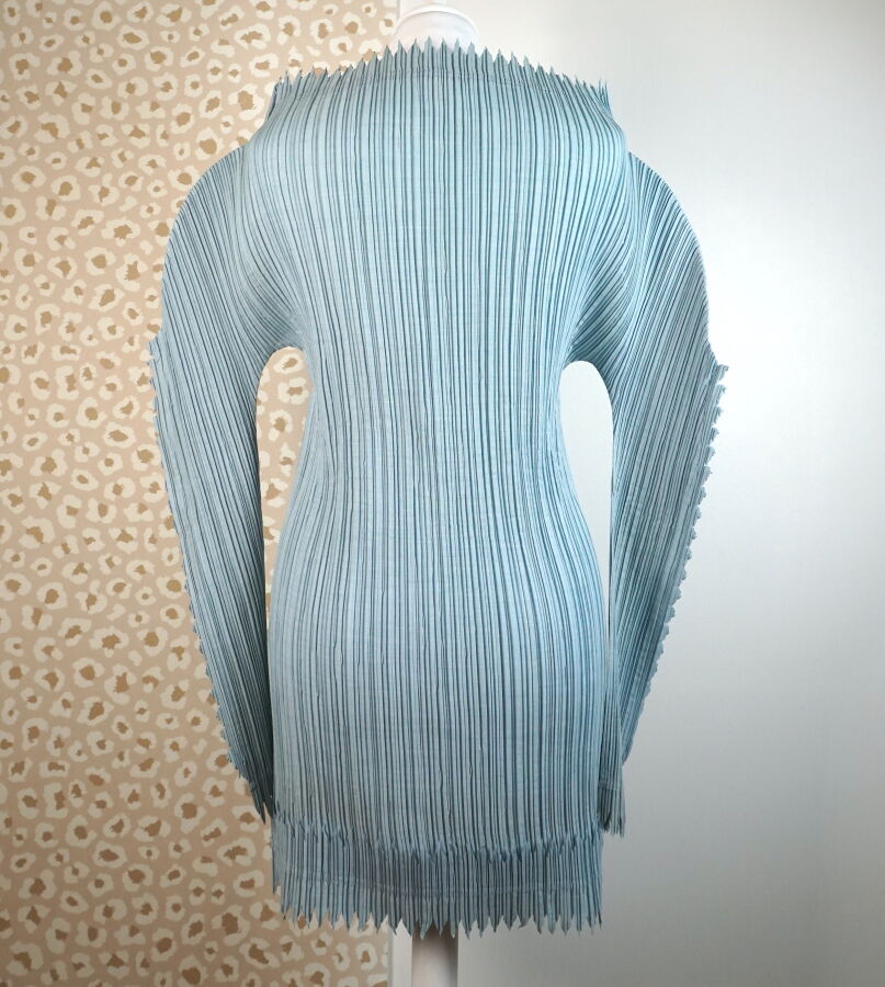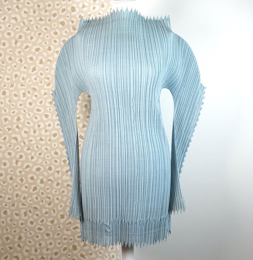 ISSEY MIYAKE : Top long en polyester plissé bleu, les extrémités découpées en pointes, étiquette annotée. T. M indiquée.