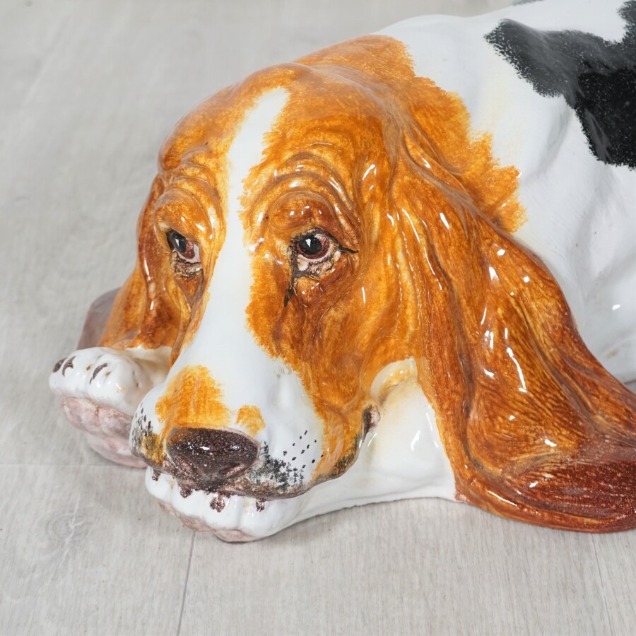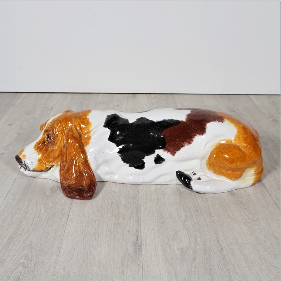 ITALIE : "Basset Hound couché", sculpture en céramique émaillée, taille réelle, circa 1950, H. 18 cm, L. 64 cm (légers sauts d'émail).