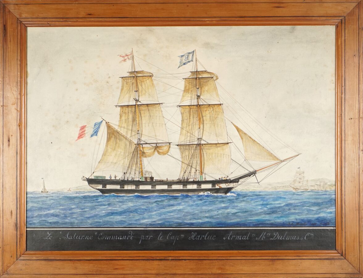 J.A.MOUTTE (XIX-XXe), "Le Saturne commandé par le capitaine Harluc, armateur Dalmas & Cie" 1868 Marseille, aquarelle sur papier, signée, située et datée en bas à droite, 43.5 x 59.7 cm (quelques taches, usures).