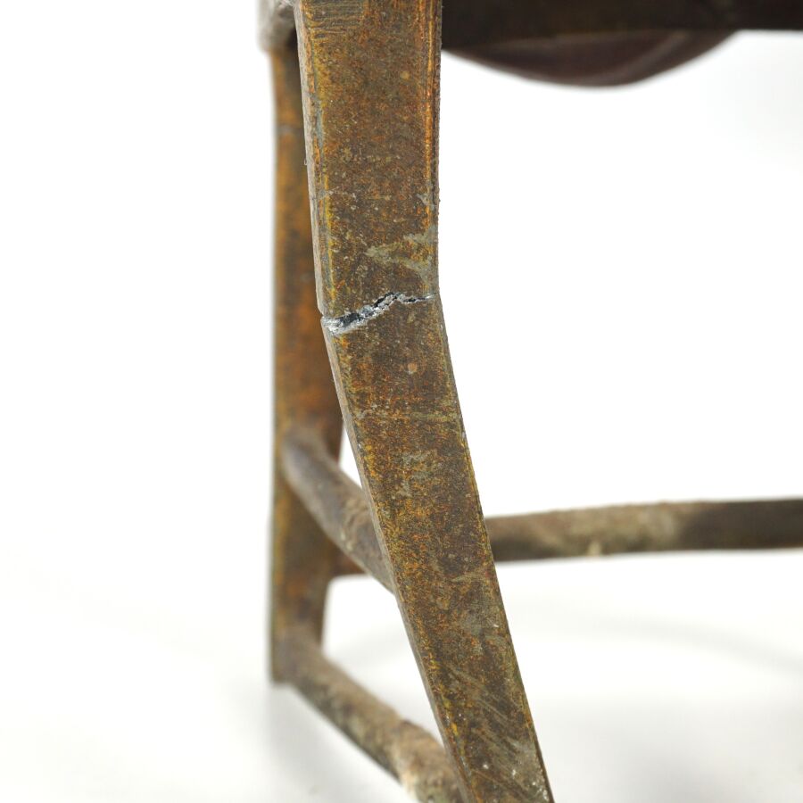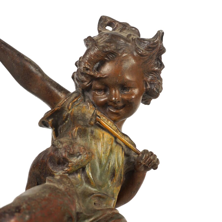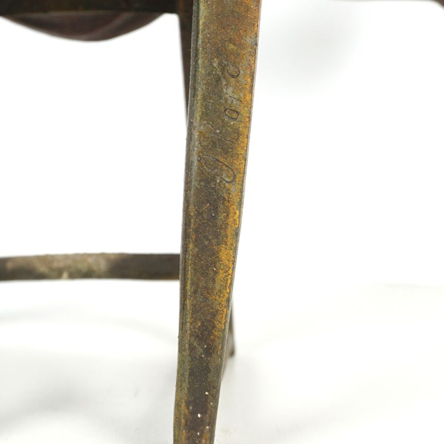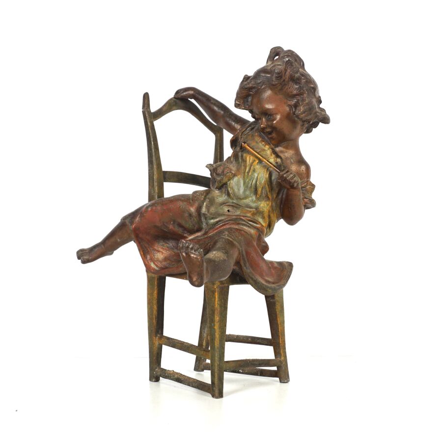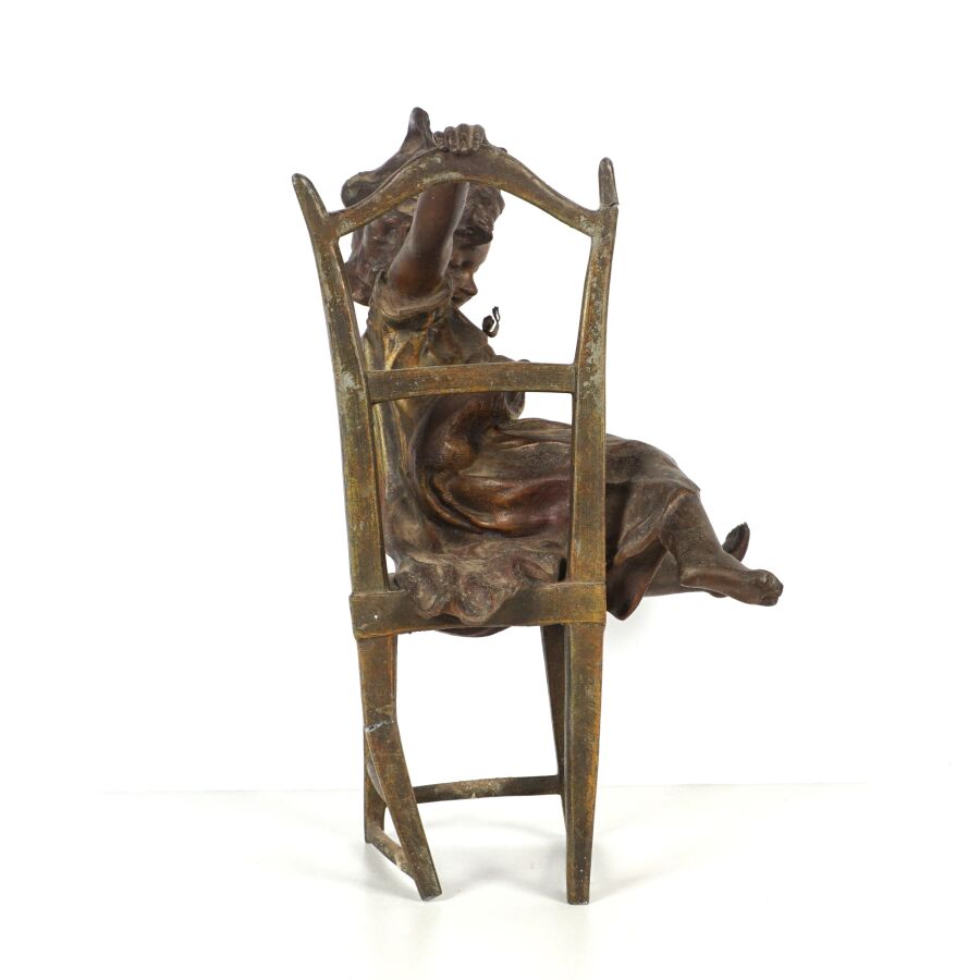 J. LORO (XXe), "Jeune fille sur sa chaise", sujet en métal patiné, signé sur le piétement arrière de la chaise, H. 29 cm (accidents aux pieds arrières et au montant droit).