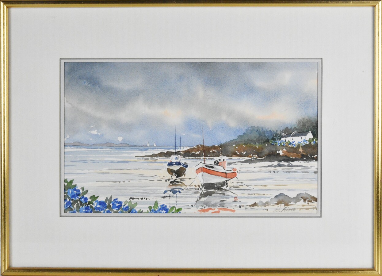 J. RIVES (XXe), "Bateaux de pêche à marée basse", aquarelle sur papier signée en bas à droite, 18 x 30.5 cm.