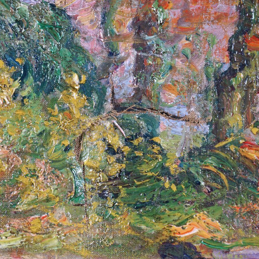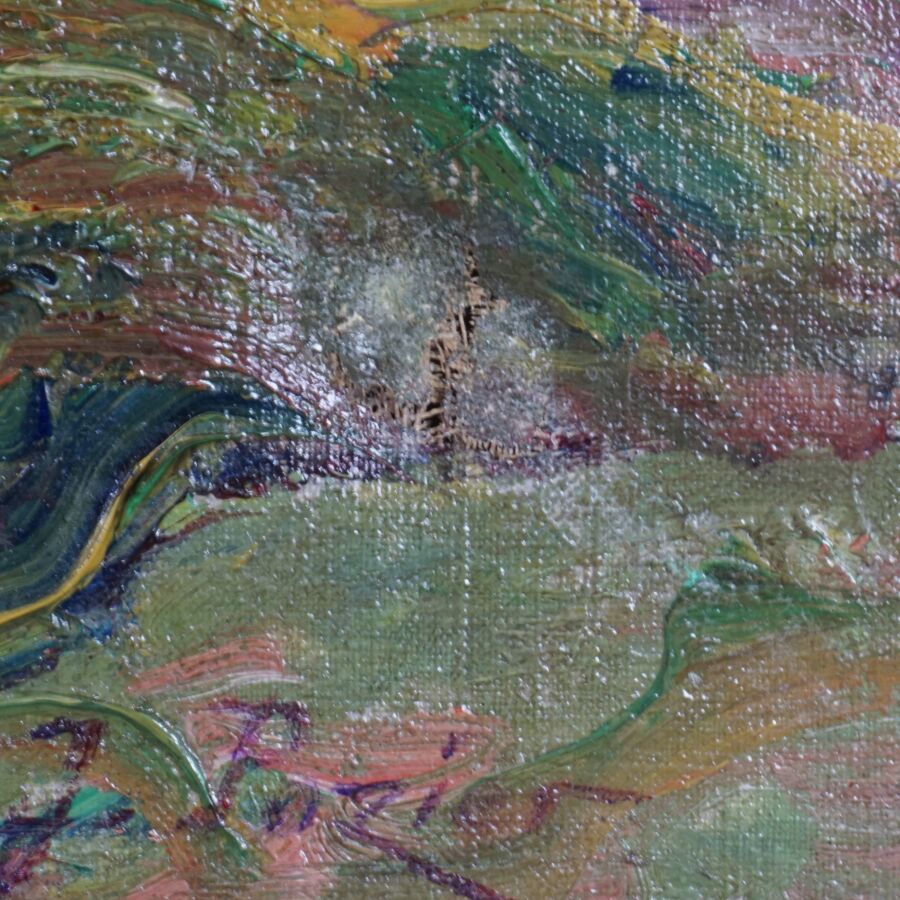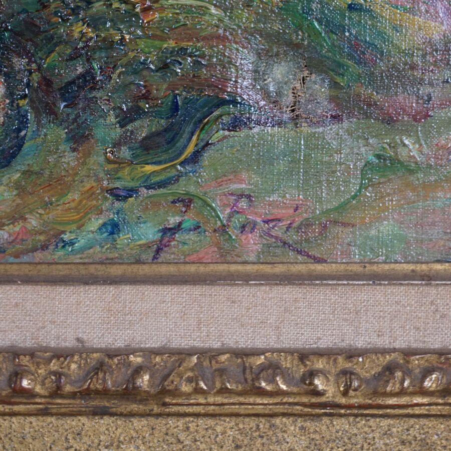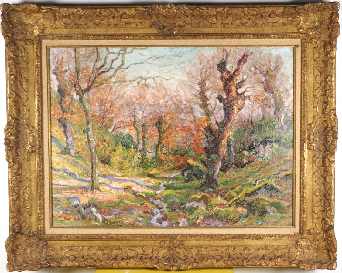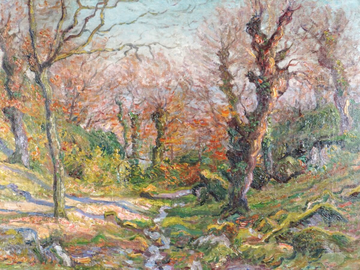 Jacinthe POZIER (1844-1915), "Paysage en sous-bois", huile sur toile signée en bas à droite, 60 x 81 cm (déchirure au centre, en haut et en bas à droite).