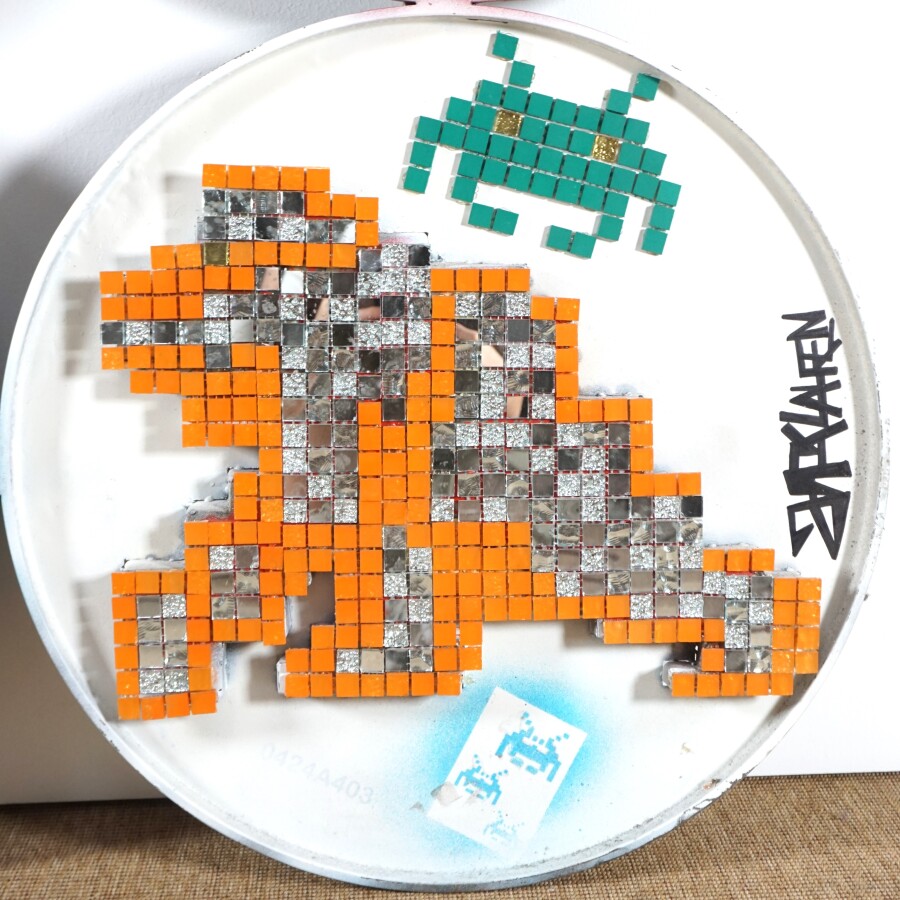 Jack LAUREN (XXe), "Composition", technique mixte sur métal, signée sur le cerclage en bas à droite, H. 117 cm. L. 117 cm (quelques manques à la mosaïque).