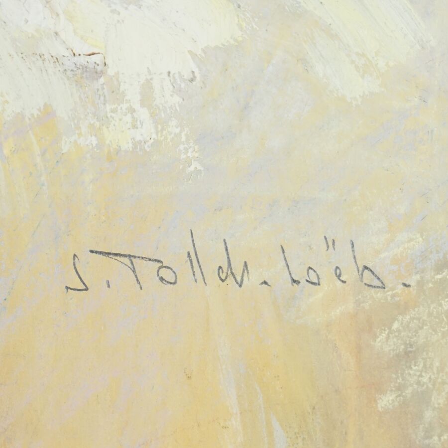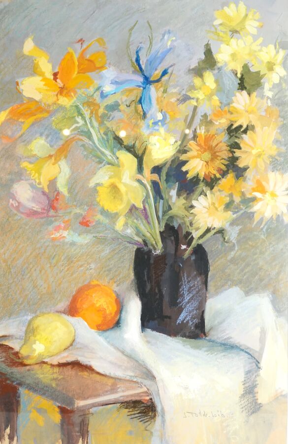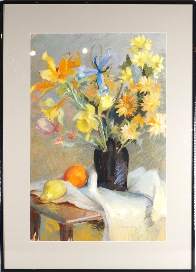 Jacqueline TOLLET-LOEB (1931-2021), "Nature morte au bouquet de fleurs, à la poire et à l'orange", pastel et rehauts de gouache, signé en bas à droite, 57 x 38,5 cm.