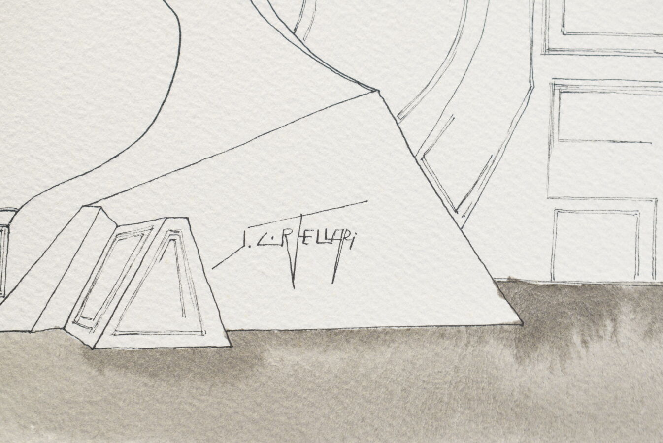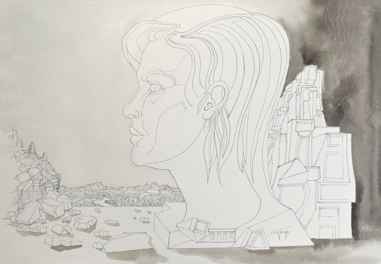 Jacques CORTELLARI (1942-2002), "Profil de Jeune Fille Dans Un Paysage", dessin à l'encre et aquarelle, signé à droite, contresigné au dos, 38 x 54.5 cm.