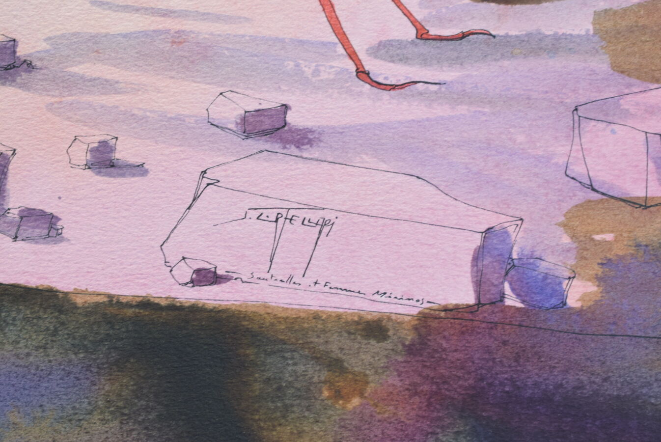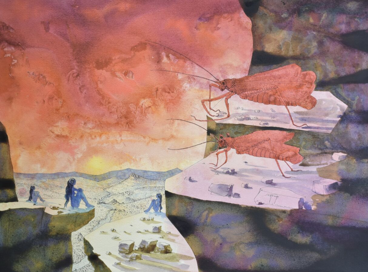 Jacques CORTELLARI (1942-2002), "Sauterelles et Femmes Merinos", dessin à l'encre et aquarelle sur papier, signé sur la droite, contresigné et daté au dos, 53.5 x 73 cm.
