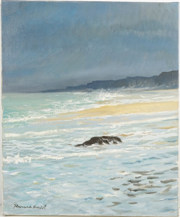 Jacques DURAND-HENRIOT (1922-1997), "Tempête sur la Grève Saint-Aubin", huile sur toile signée en bas à gauche, titrée et contresignée au dos, 46 x 38 cm.
