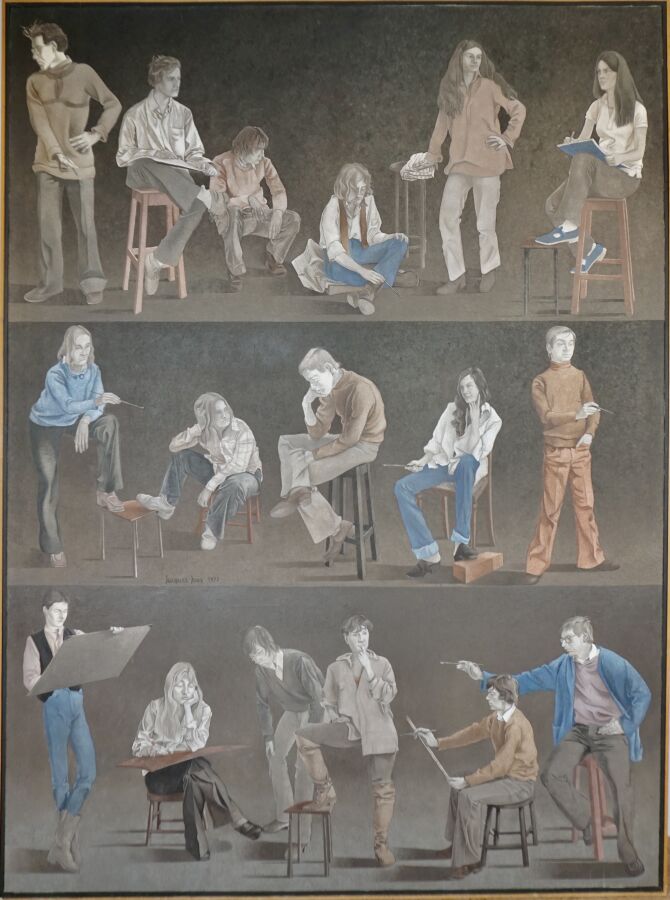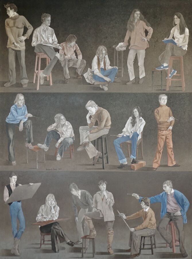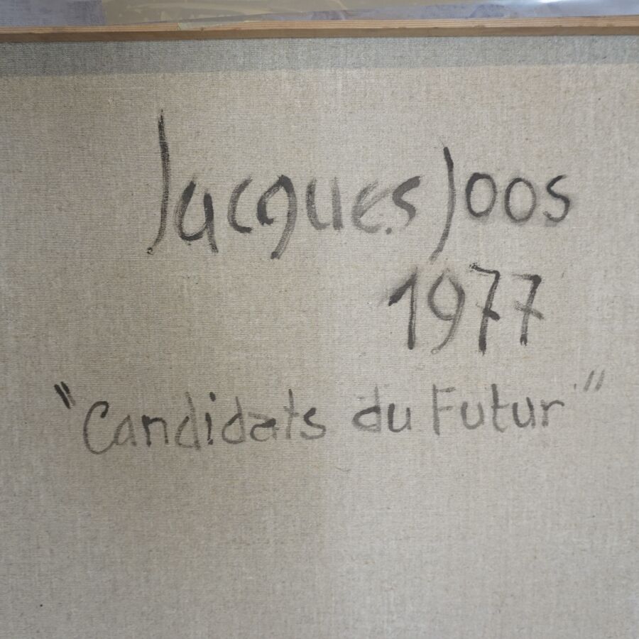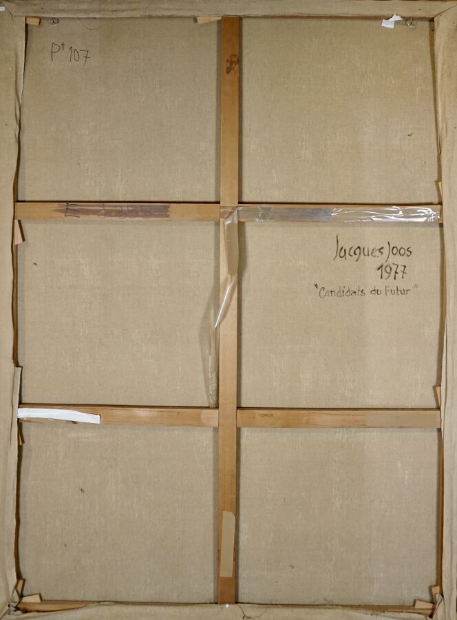 Jacques JOOS (1945-2021), "Candidats du futur", 1977, technique mixte sur toile, signée et datée en bas au milieu à gauche, signée, titrée et datée au dos, 250,5 x 185 cm.
