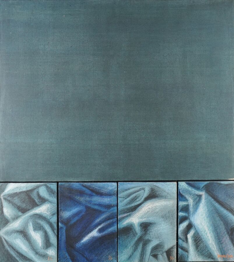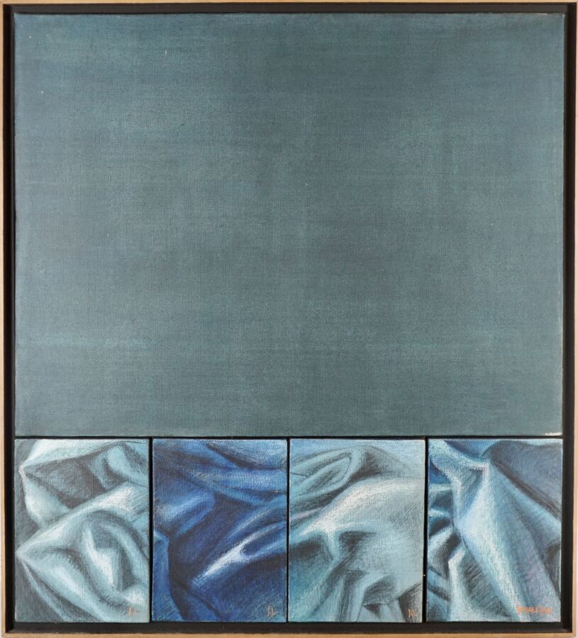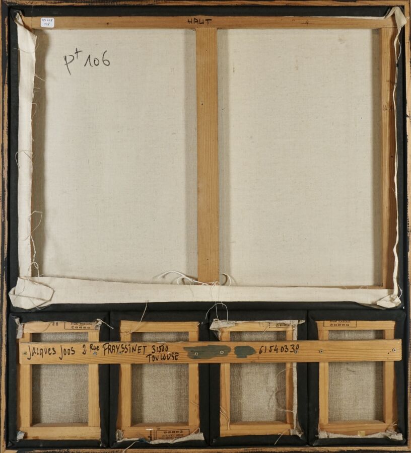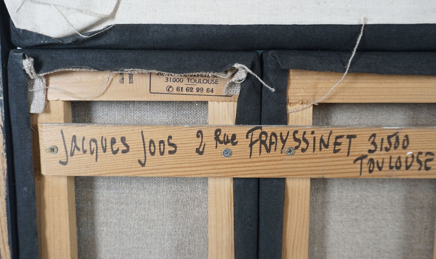 Jacques JOOS (1945-2021), "Composition", technique mixte sur toile, signée et monogrammée en bas à droite, signée, située au dos, 72 x 65 cm (manques).