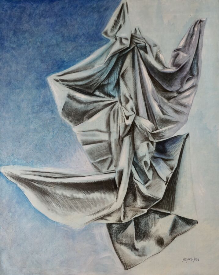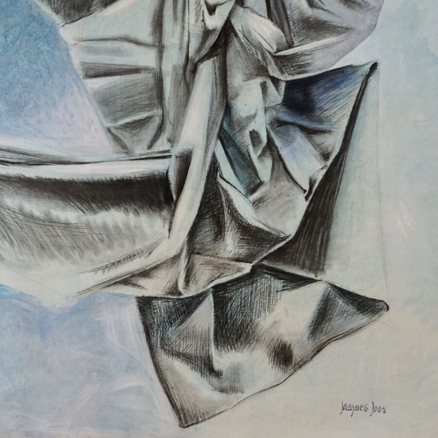 Jacques JOOS (1945-2021), "Drapé bleu", technique mixte sur toile, signée en bas à droite, signée et datée au dos, 162.5 x 129 cm